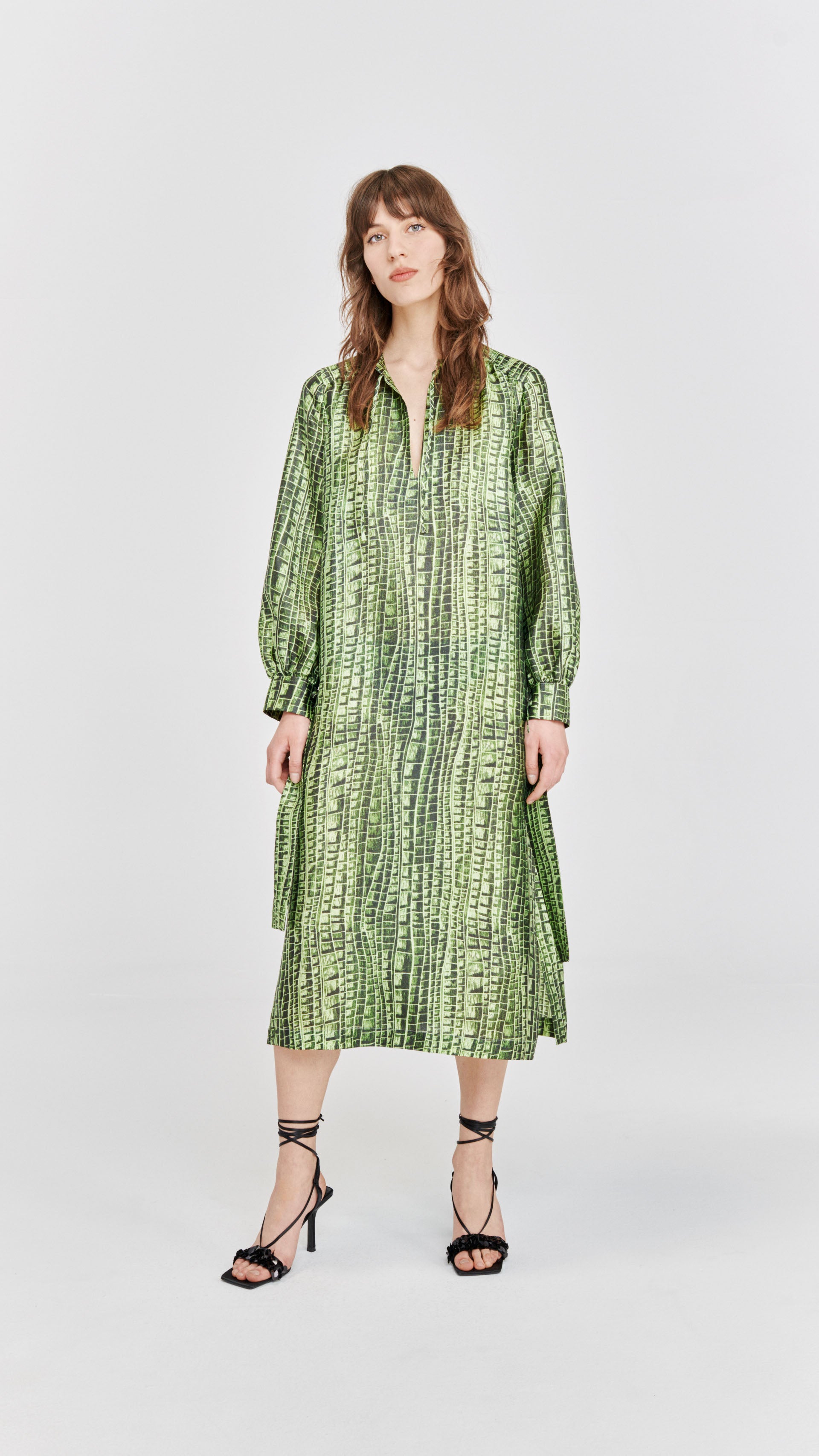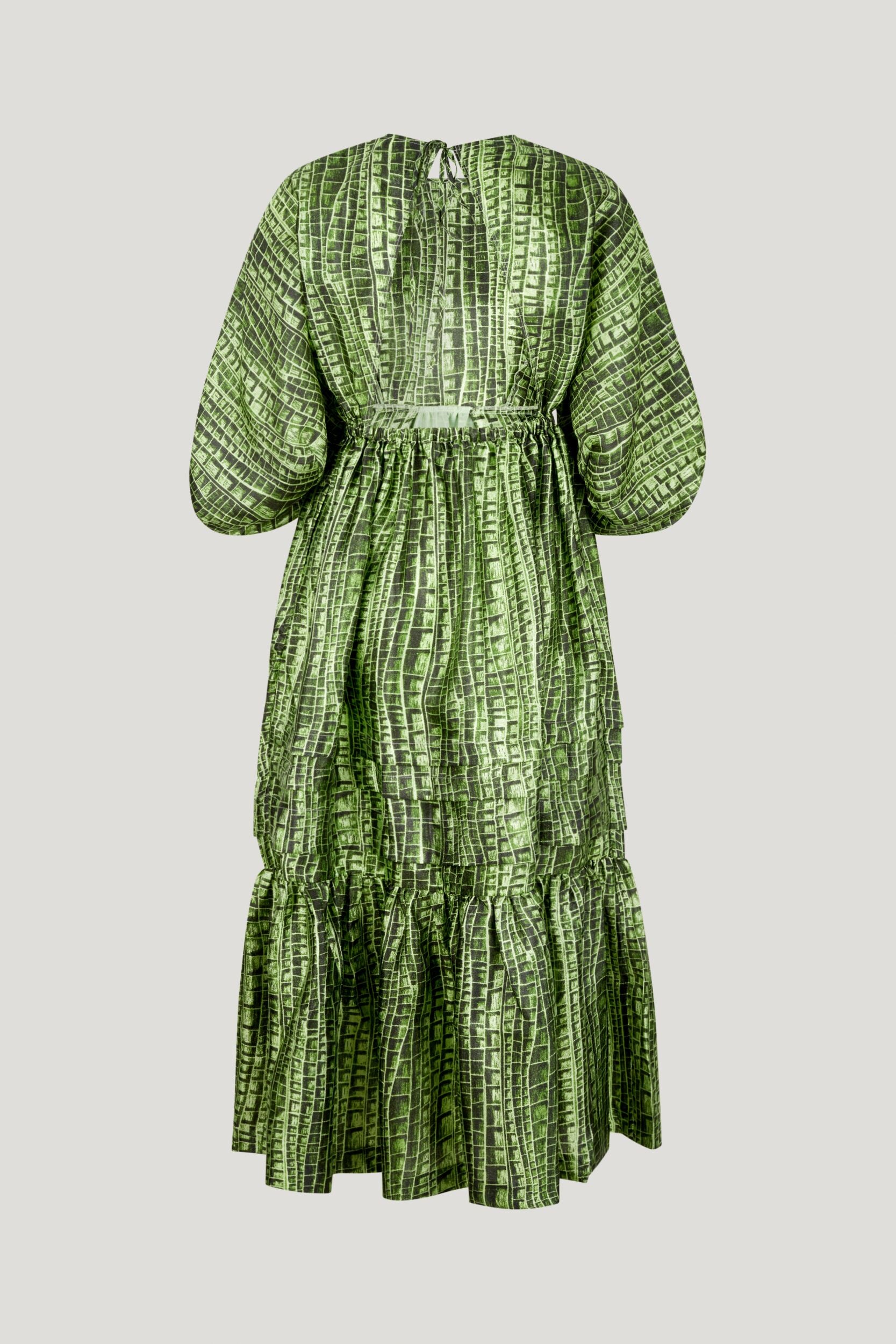 An ankle-length dress with an open back and elasticated panel at the lower back. There is a tie at the neck and full lining through the skirt. The dress features side pockets, an A-line silhouette, and pintuck ruffles on the skirt.
