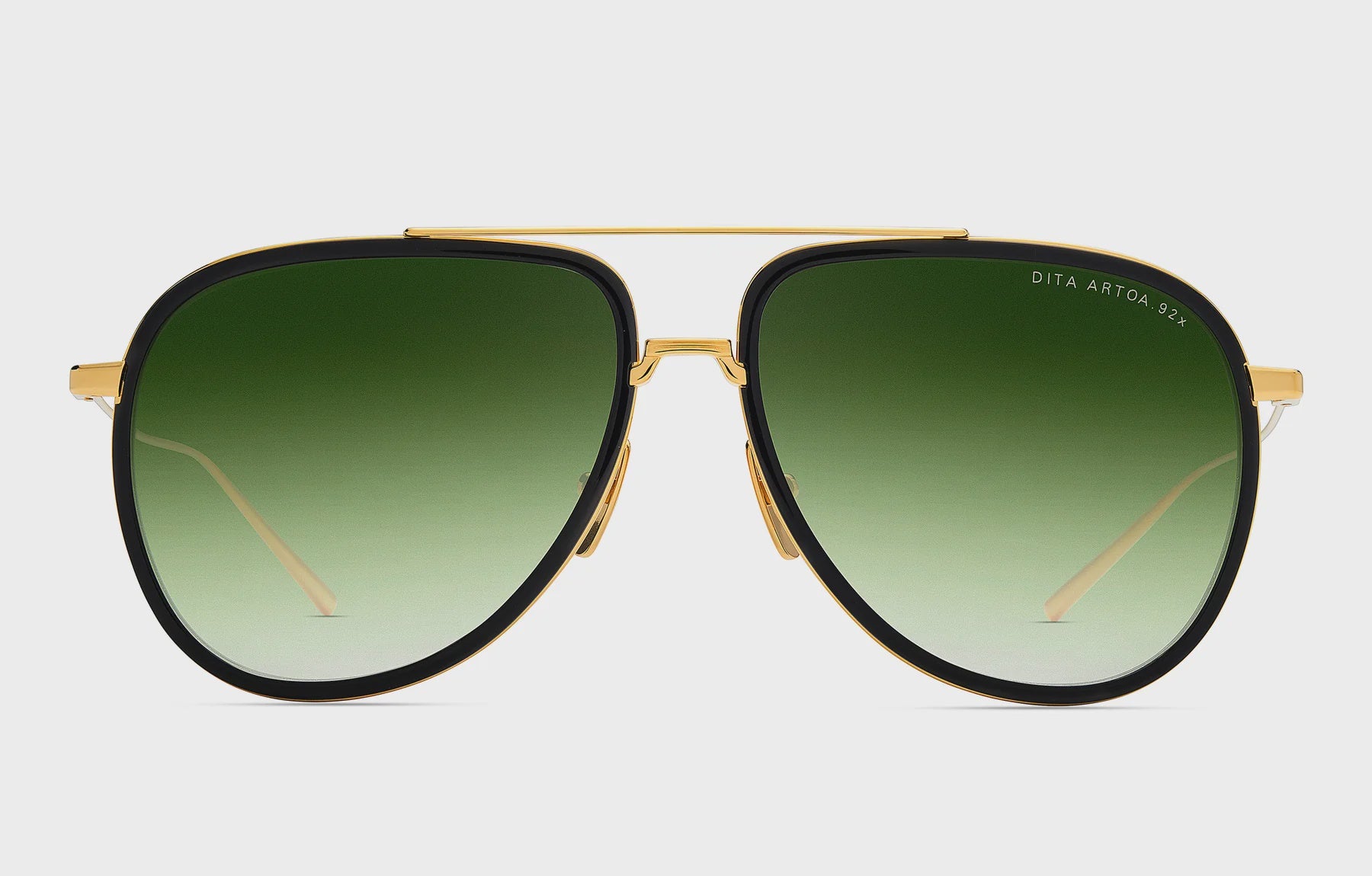 Each variation reveals a distinctive harmony: solid turquoise lenses paired with turquoise enamel temple tips, or deep green enamel filling golden temples in another colorway. By mixing a navigator shape with an extraordinary color palette and the richness of acetate detailing, ARTOA.92X bridges past and present—an enduring classic reborn.