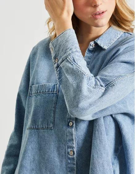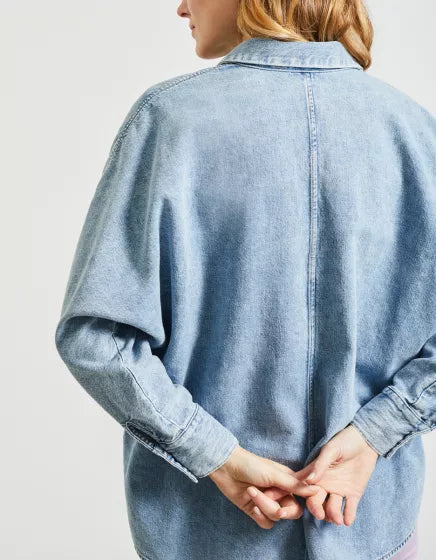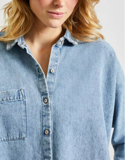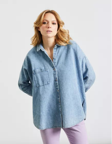 The Camila shirt in denim V-360. A shirt made with eco-friendly cotton, that can be worn every day, a sure sign of fluidity and femininity. A basic and modern cut, that guarantees freedom of movement.