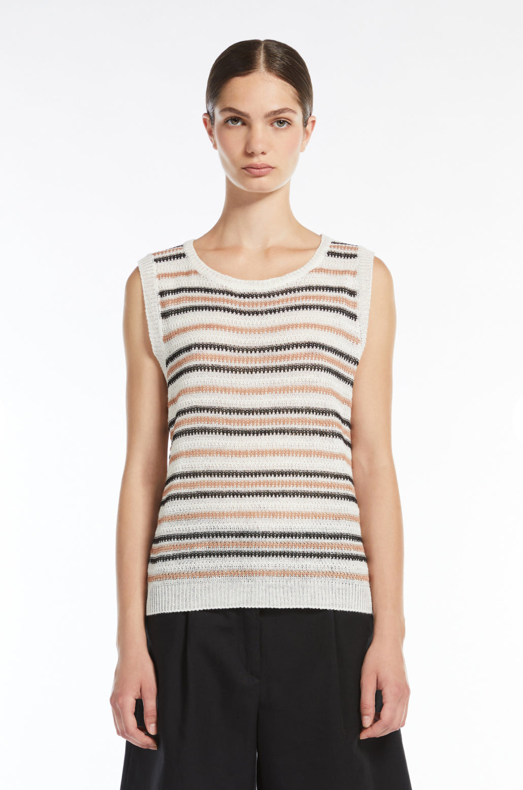 Feel cool and look polished in this sleeveless linen sweater that's wrapped in neutral-hued stripes.