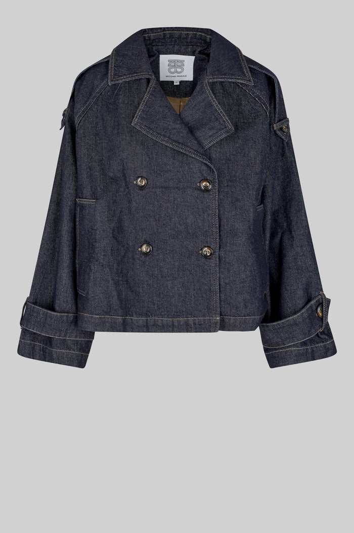 Second Female denim jacket made in a cotton denim with dark blue wash and contrast stitching. Featuring a wide lapel collar, double-breasted fastening at the front and straps with buttons at the shoulders. Raglan sleeves with adjustable straps at the cuffs. Relaxed fit with straight, slightly boxy silhouette.