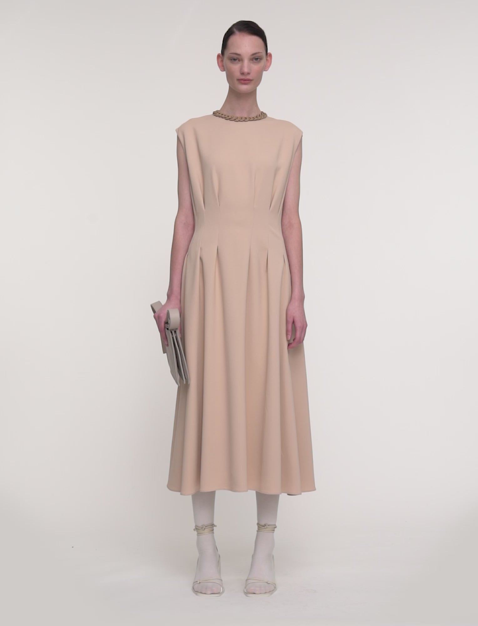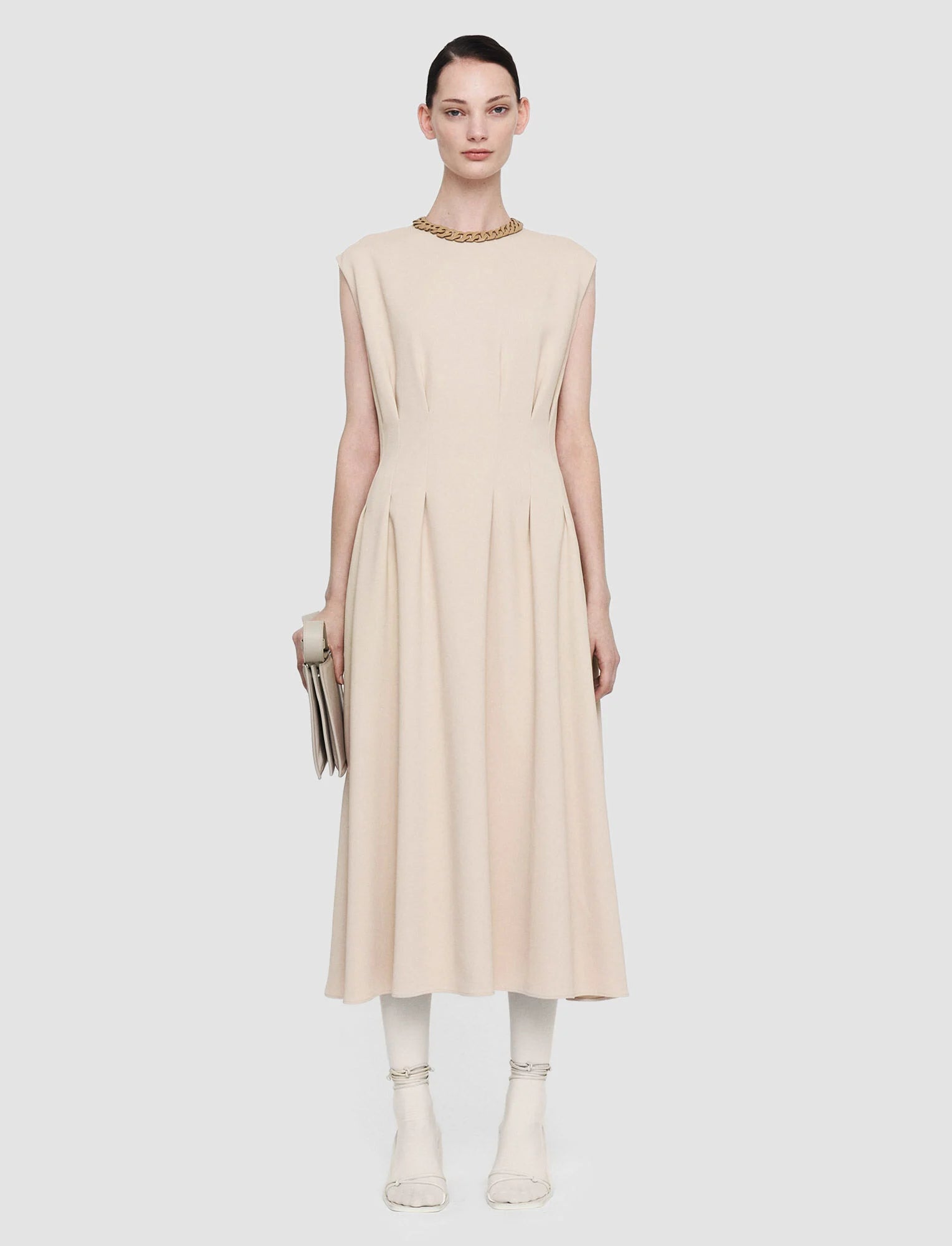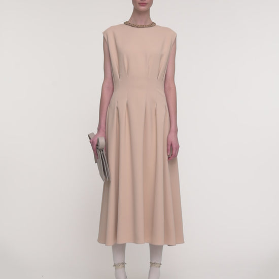 The Comfort Cady Delma Dress is a mid-length, fitted waist dress, with pleat detailing. Crafted from a viscose blend which has a light and crisp hand feel, this dress is lined with an invisible zip at the back. Its fluid and drapes down beautifully.