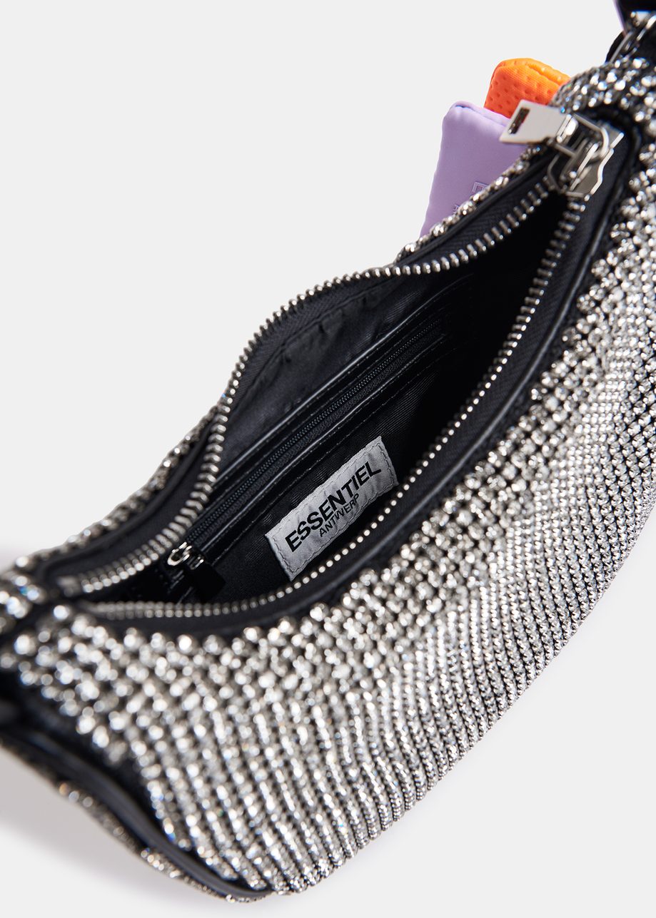 Studded with light-catching glass rhinestones, this small shoulder bag makes a perfect companion to evening events and parties. The curved silhouette has been finished with a silver-tone zip fastening and a detachable key chain strung with two mini pouches. The faux leather top handle sits comfortably over your shoulder or in the crook of your arm.