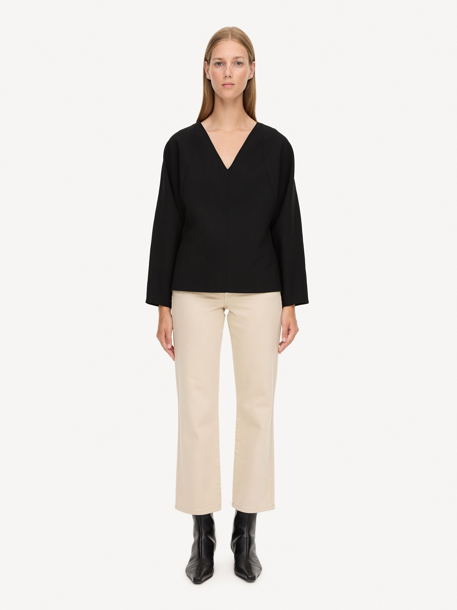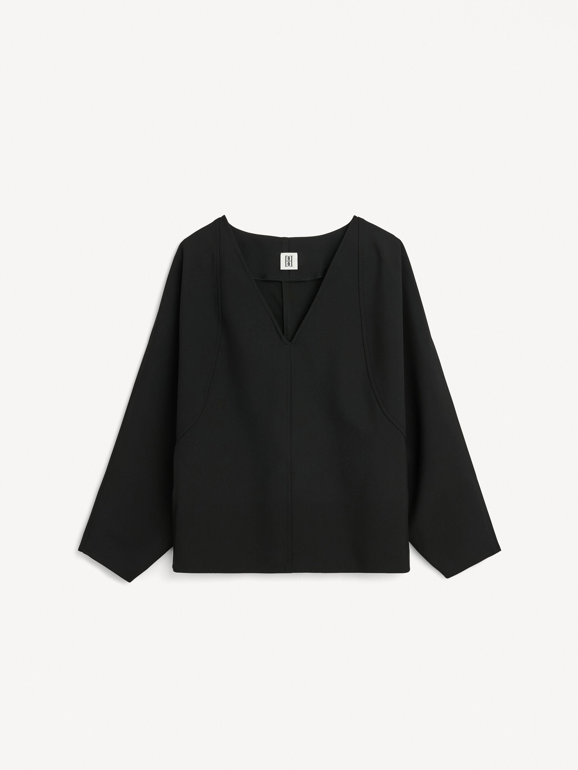 The Elya blouse is a timeless addition to the curated wardrobe. Designed with long sleeves, a sharp V neckline, and curved panels, the style shapes to a wide fit. Style it with a turtleneck and tailored trousers for a contemporary workwear look.