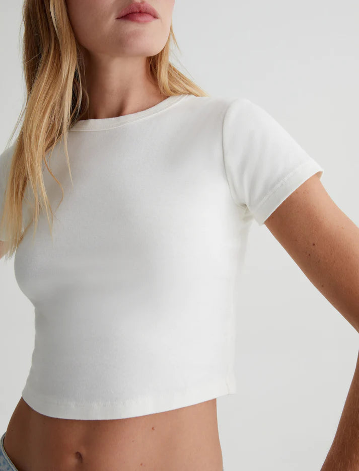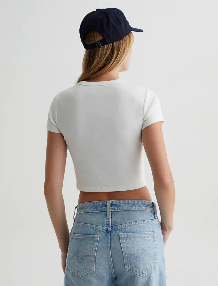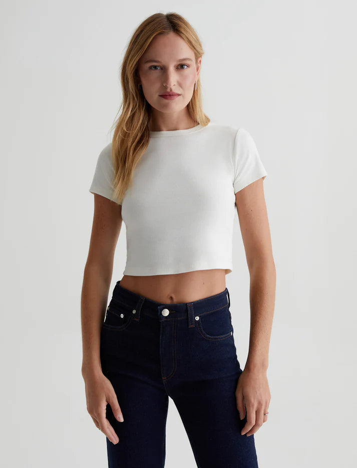 The EmRata x AG Emily Crew is a classic baby tee with a stylized crop and shrunken fit that pairs back to any look in your closet. Made from our super soft 1x1 baby rib, the Ex-White colorway offers a polished look in a comfortable everyday staple. From layering with blazers or pairing with high-waisted trousers, this cropped crew refines any look with a fashionable edge. Designed in partnership with Emily Ratajkowski, the EmRata x AG capsule reflects the model's personal style with a curated collection of versatile pieces able to pair effortlessly together for elevated style.