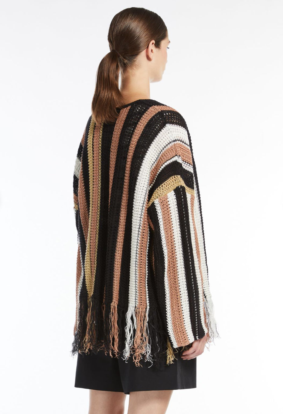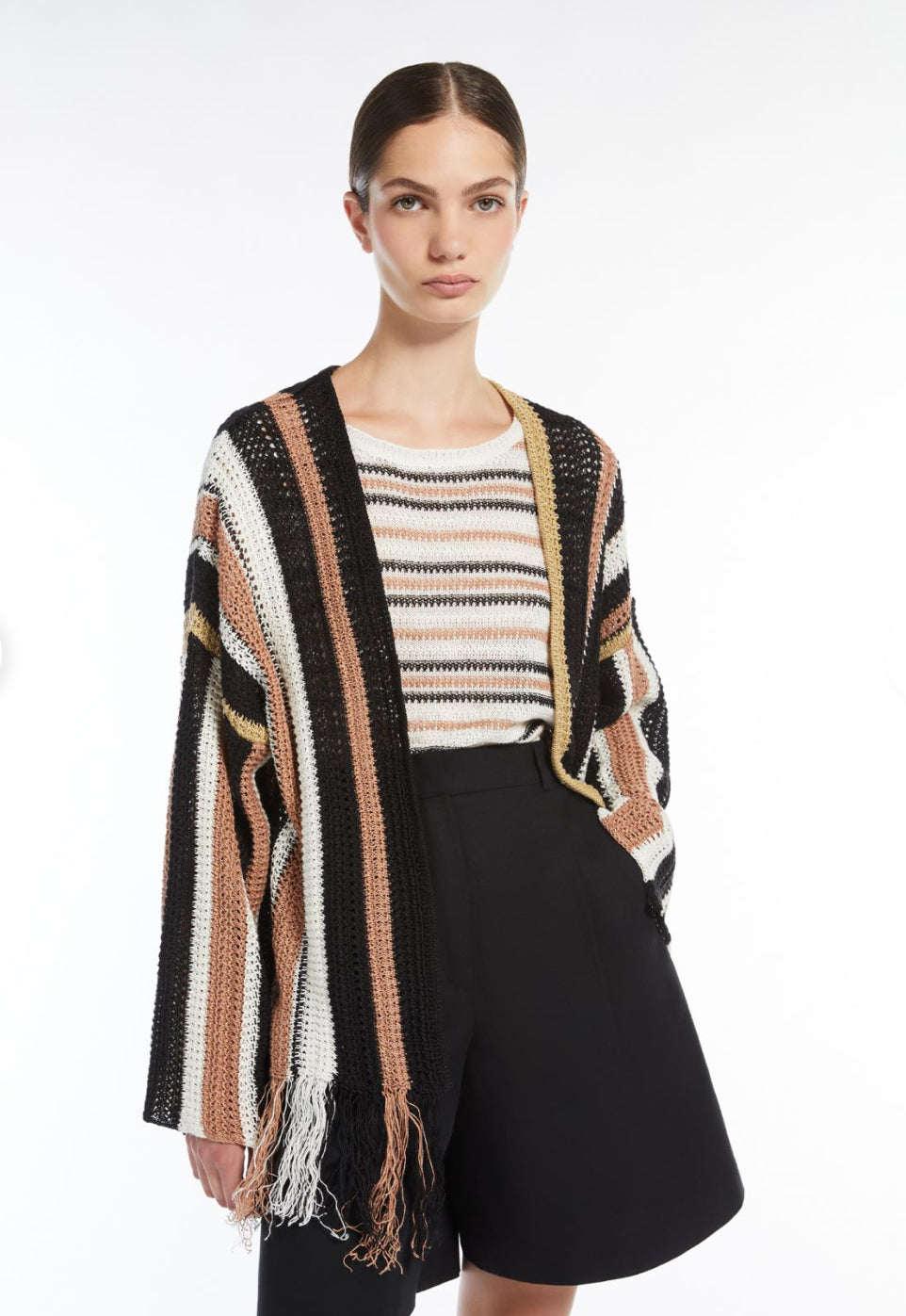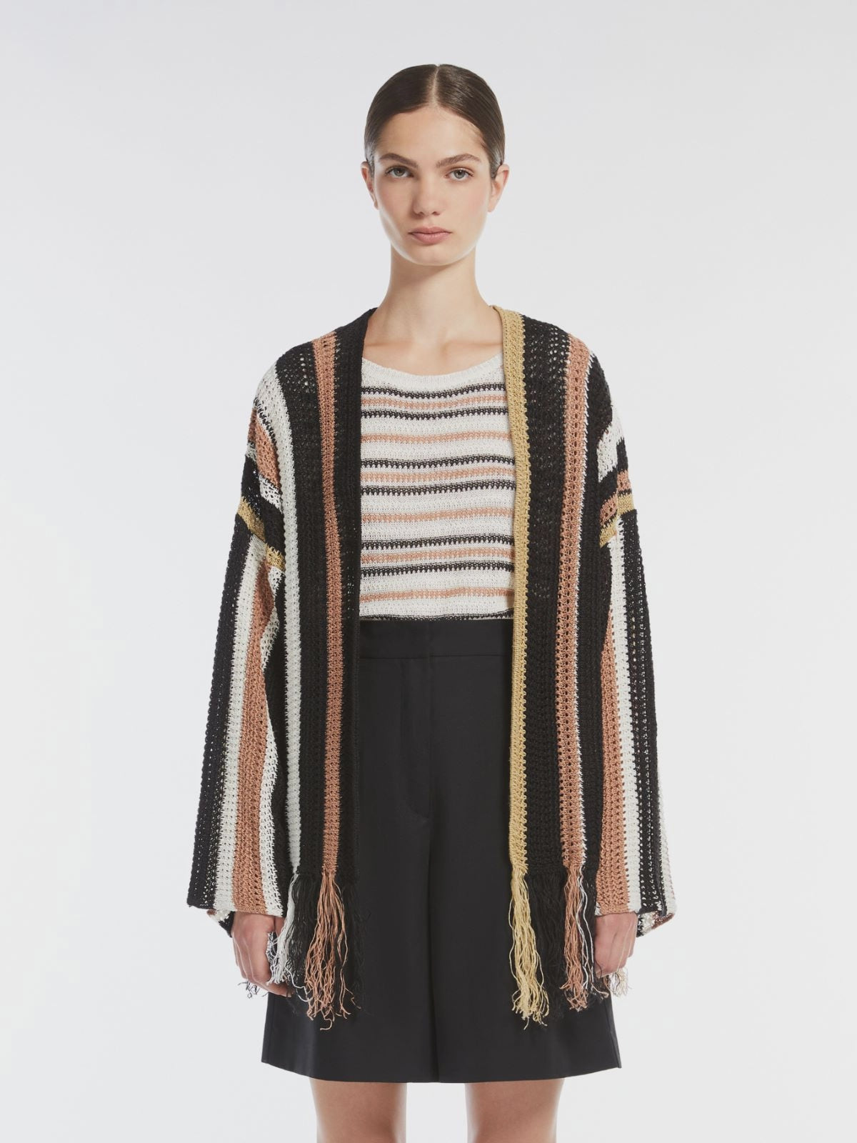 Cardigan in pure linen yarn, in a patterned crochet stitch. Oversized style featuring a relaxed fit with long low set sleeves and a fringe motif at the hem that adds movement.