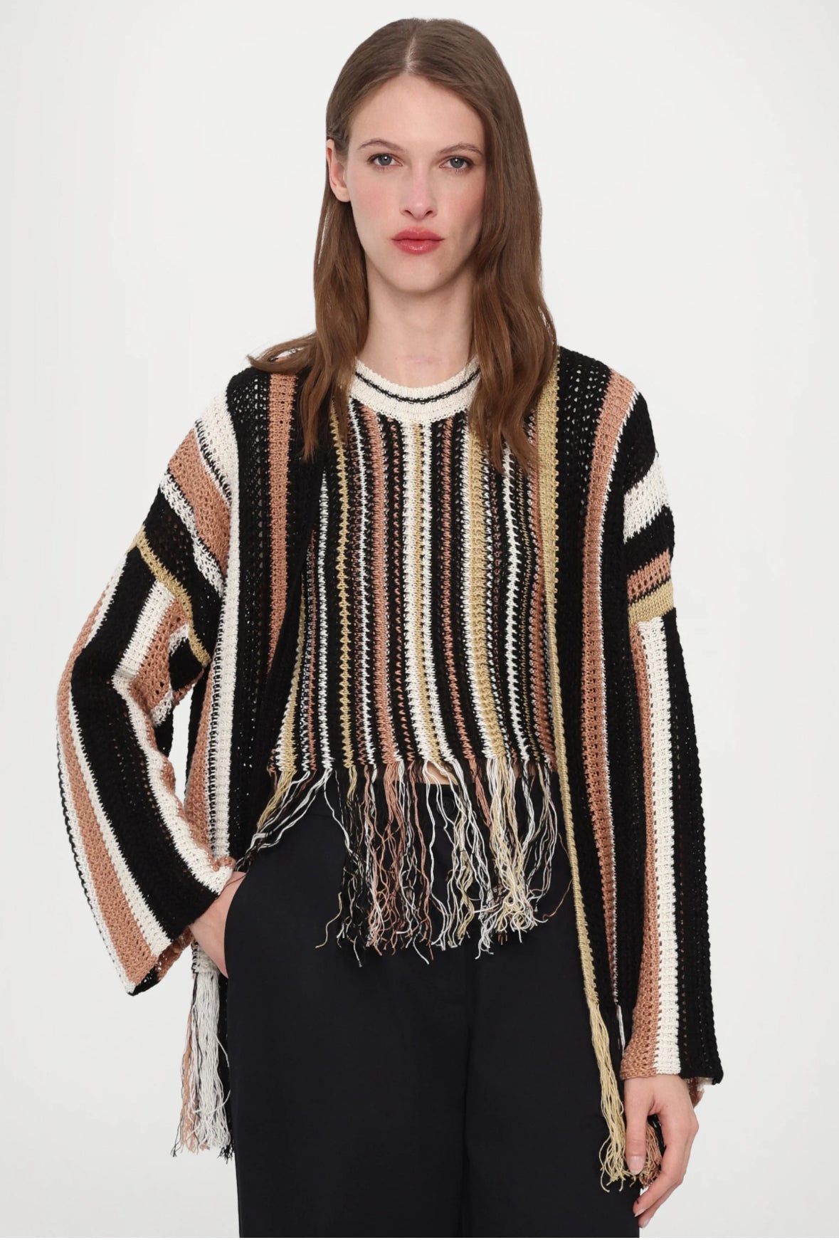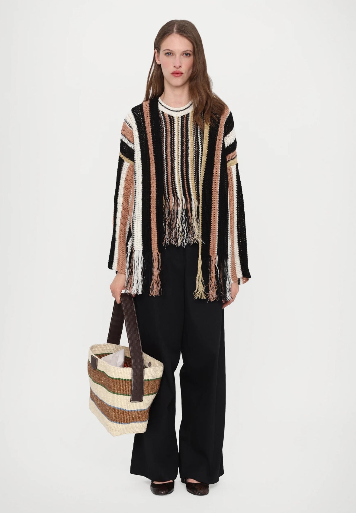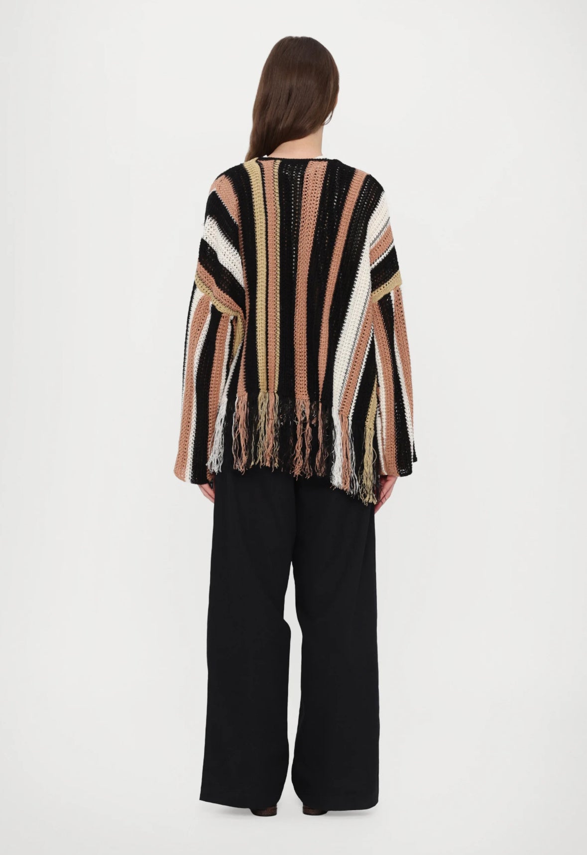 Cardigan in pure linen yarn, in a patterned crochet stitch. Oversized style featuring a relaxed fit with long low set sleeves and a fringe motif at the hem that adds movement.