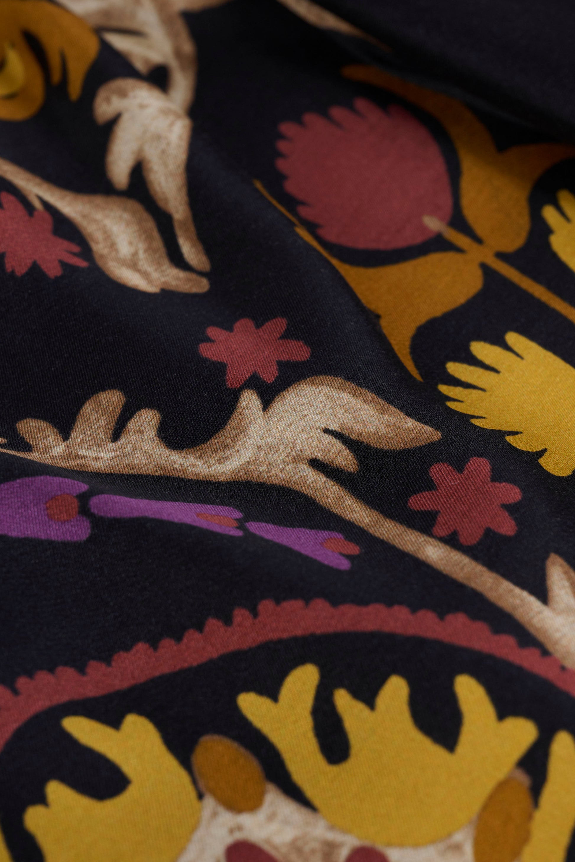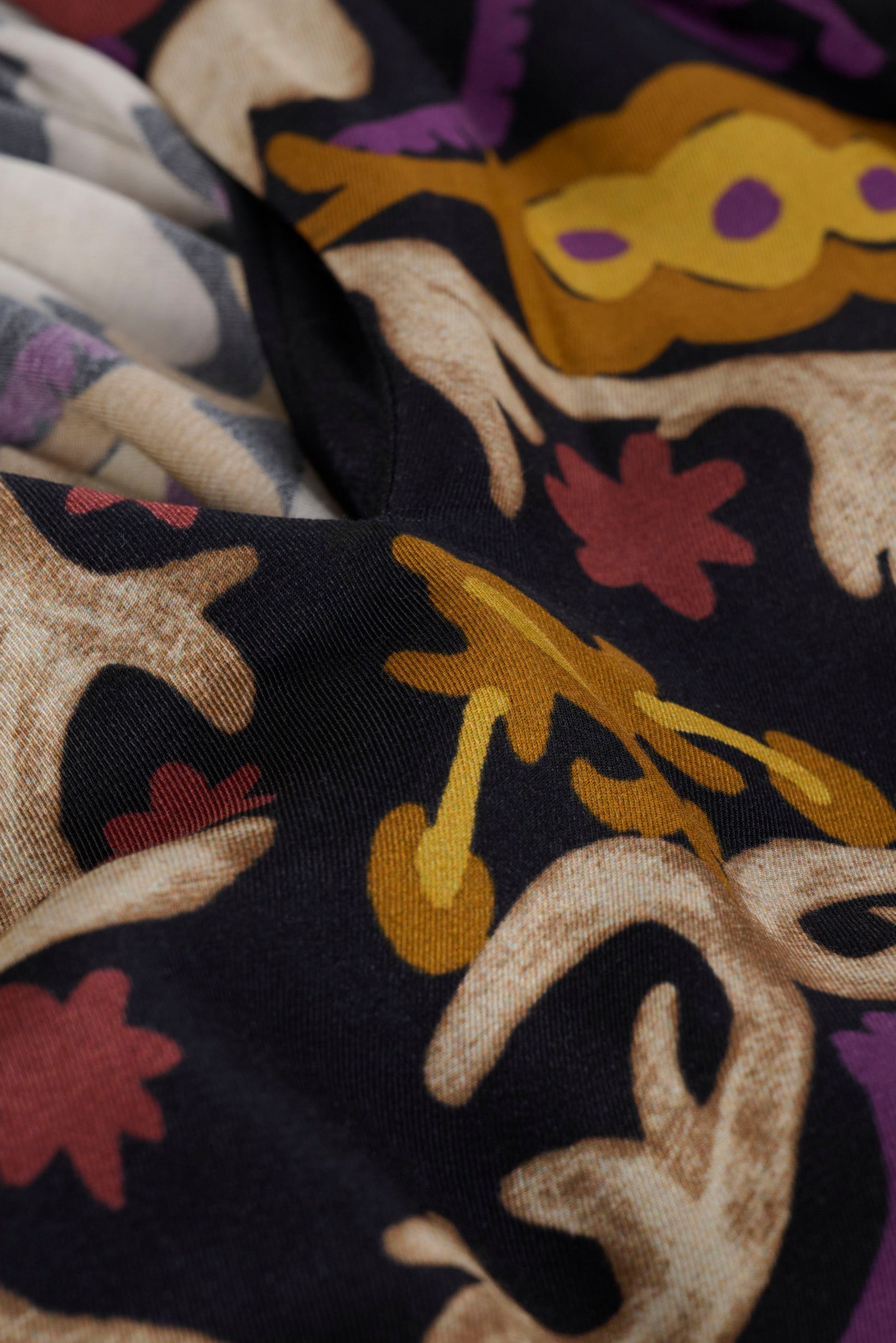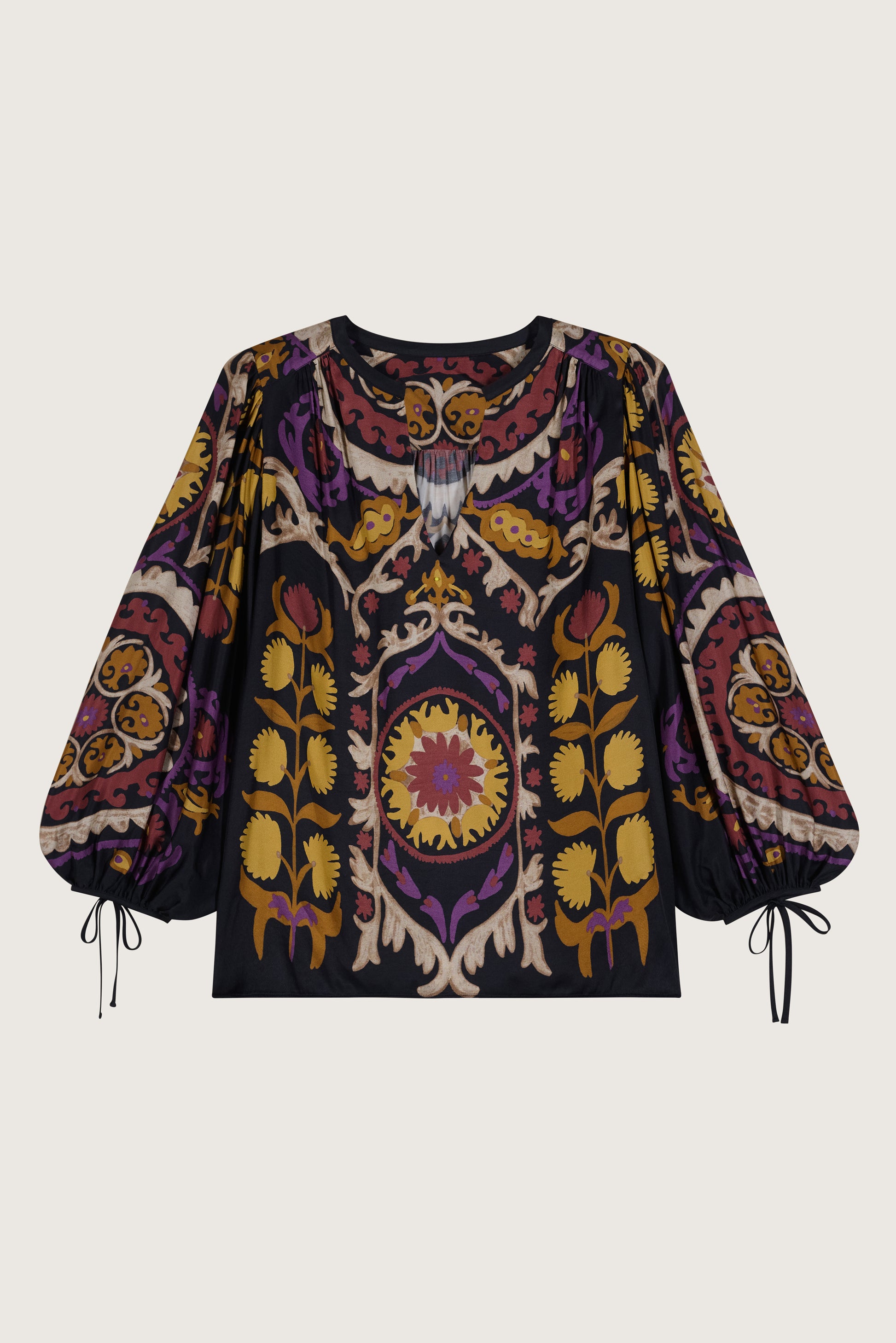 The FIDA shirt will transport you with its cheerful boho vibe. This blouse adopts a Henley neckline with a tie, three-quarter length sleeves and ruching on the shoulders and cuffs for a beautiful balloon shape. It is made from flowing viscose decorated with a colourful Romanian-inspired motif. The detail that makes all the difference? The romantic ties on the cuffs. Pair with slim-fit jeans or a pencil skirt.