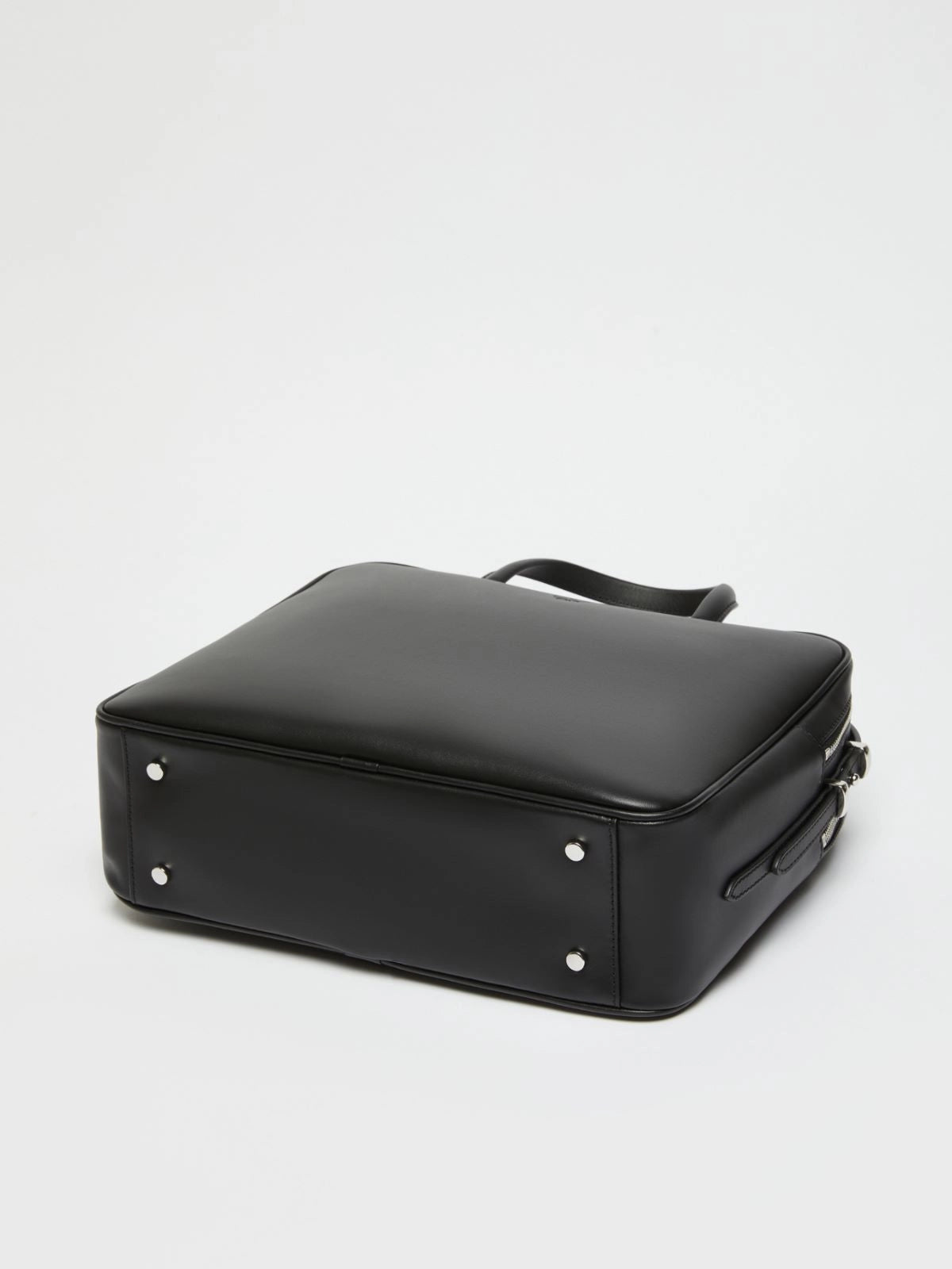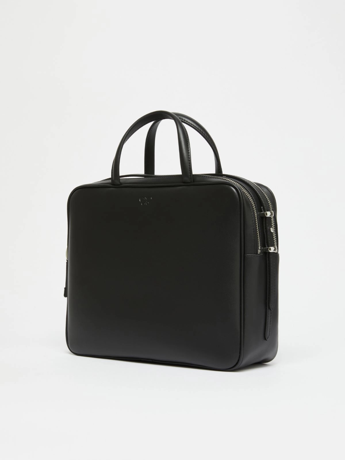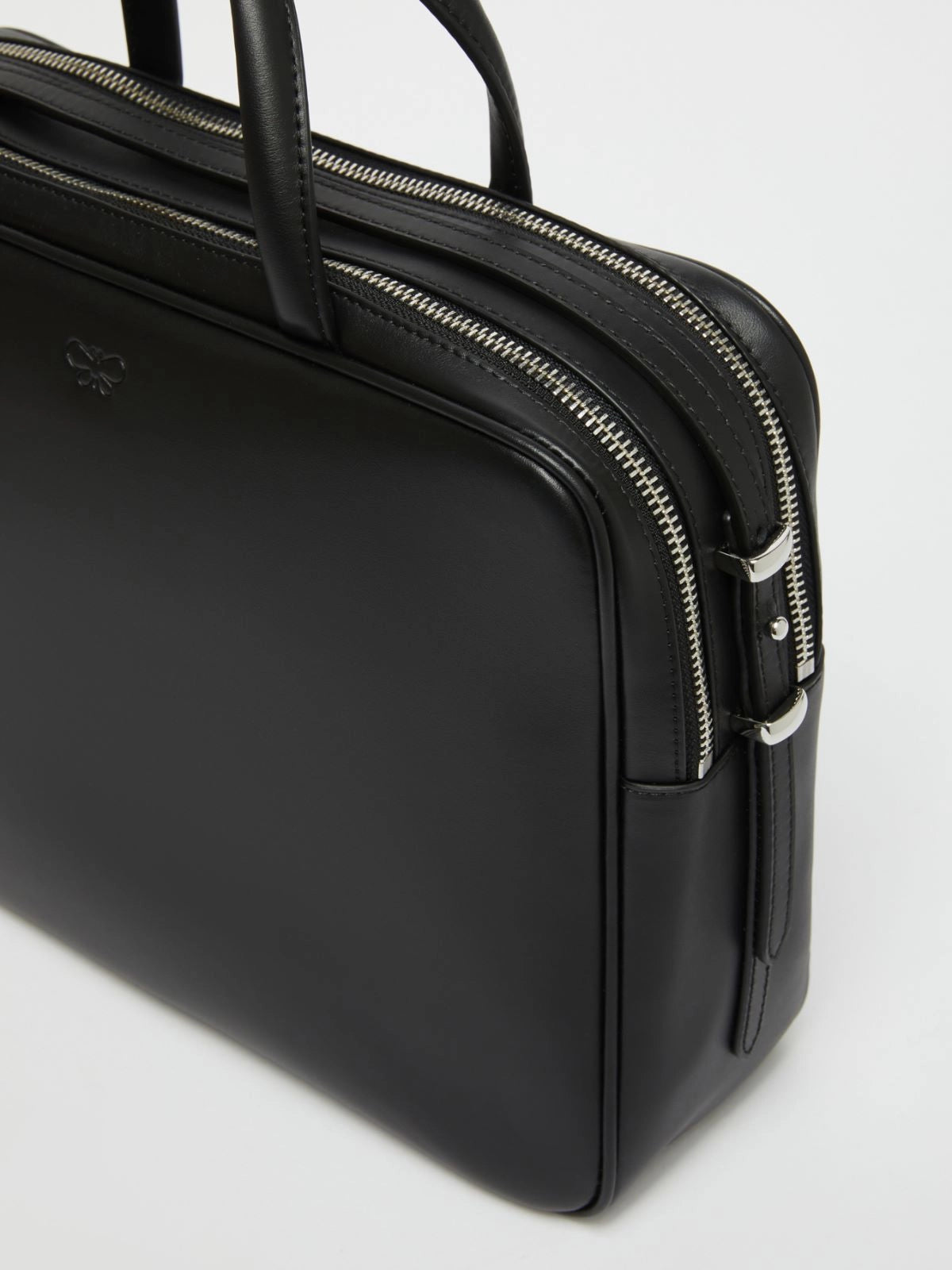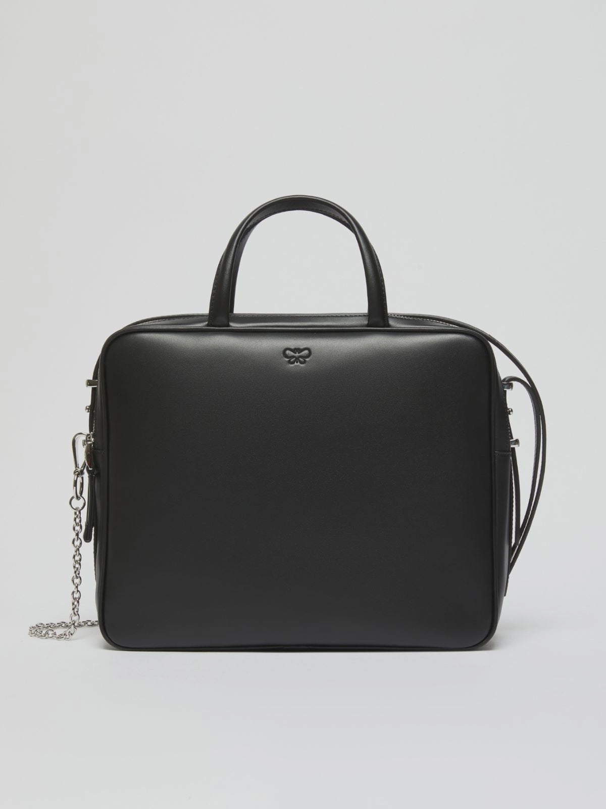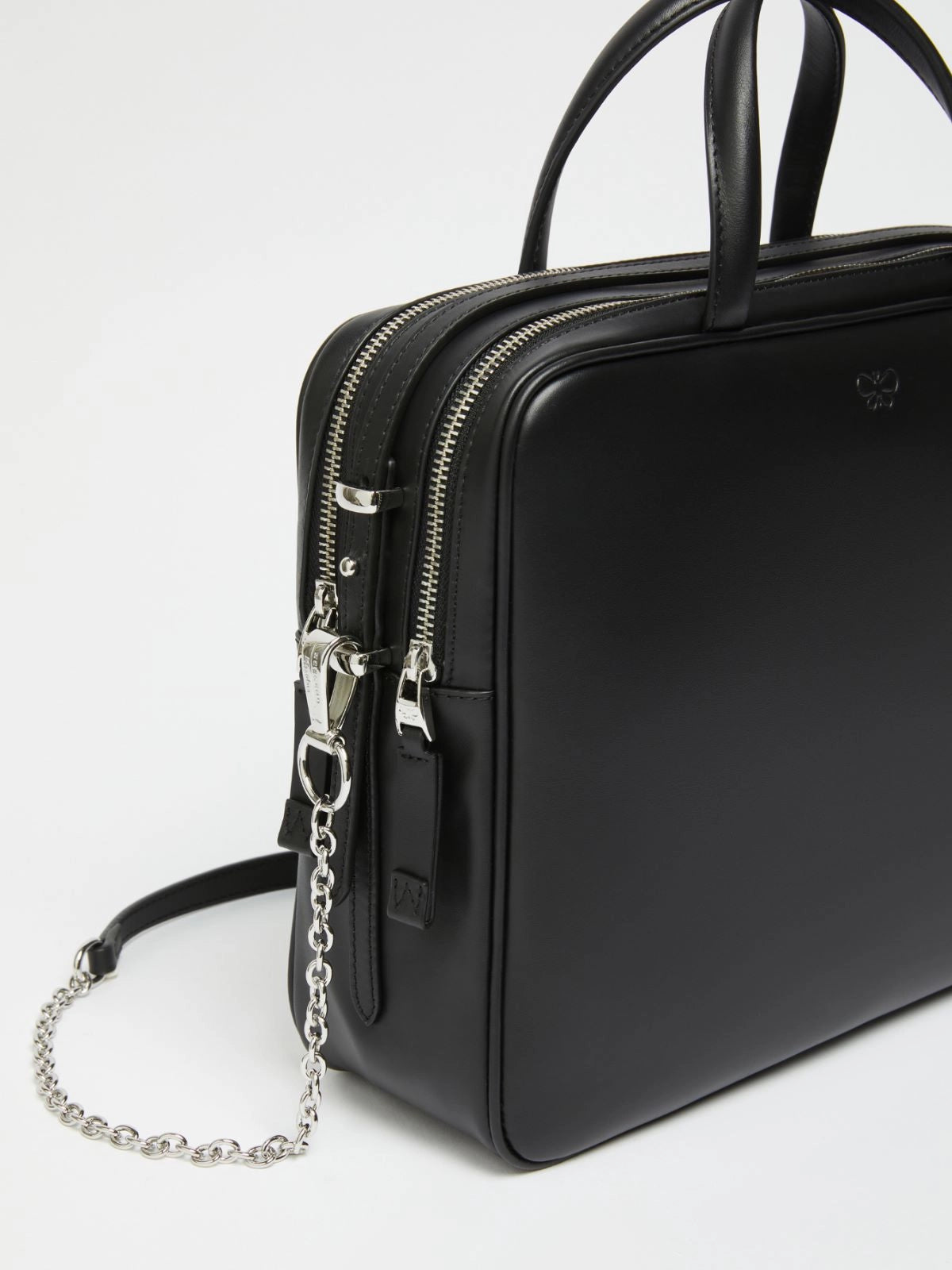 Medium-sized handbag, made entirely of leather. The satchel design features a double handle and two side compartments closed with zips at the top. The removable double shoulder strap – a long leather one and shorter chain one with leather shoulder pad – allows for shoulder or crossbody use. Lined interior. The front is customised with embossed matching butterfly logo detail. Size: 30 x 10 x 24 cm.