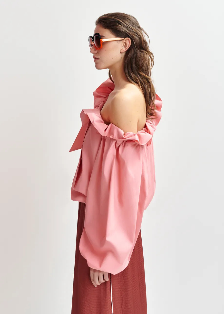 Oversized top is crafted from 100% cotton. Designed with an oversized fit, it features a self-fabric tie fastening at the collar. The top is adorned with delicate ruffle details, while the voluminous sleeves with elasticated cuffs offer a structured look. The elasticated waist creates a flattering silhouette. It can also be worn off the shoulder for a versatile look.
