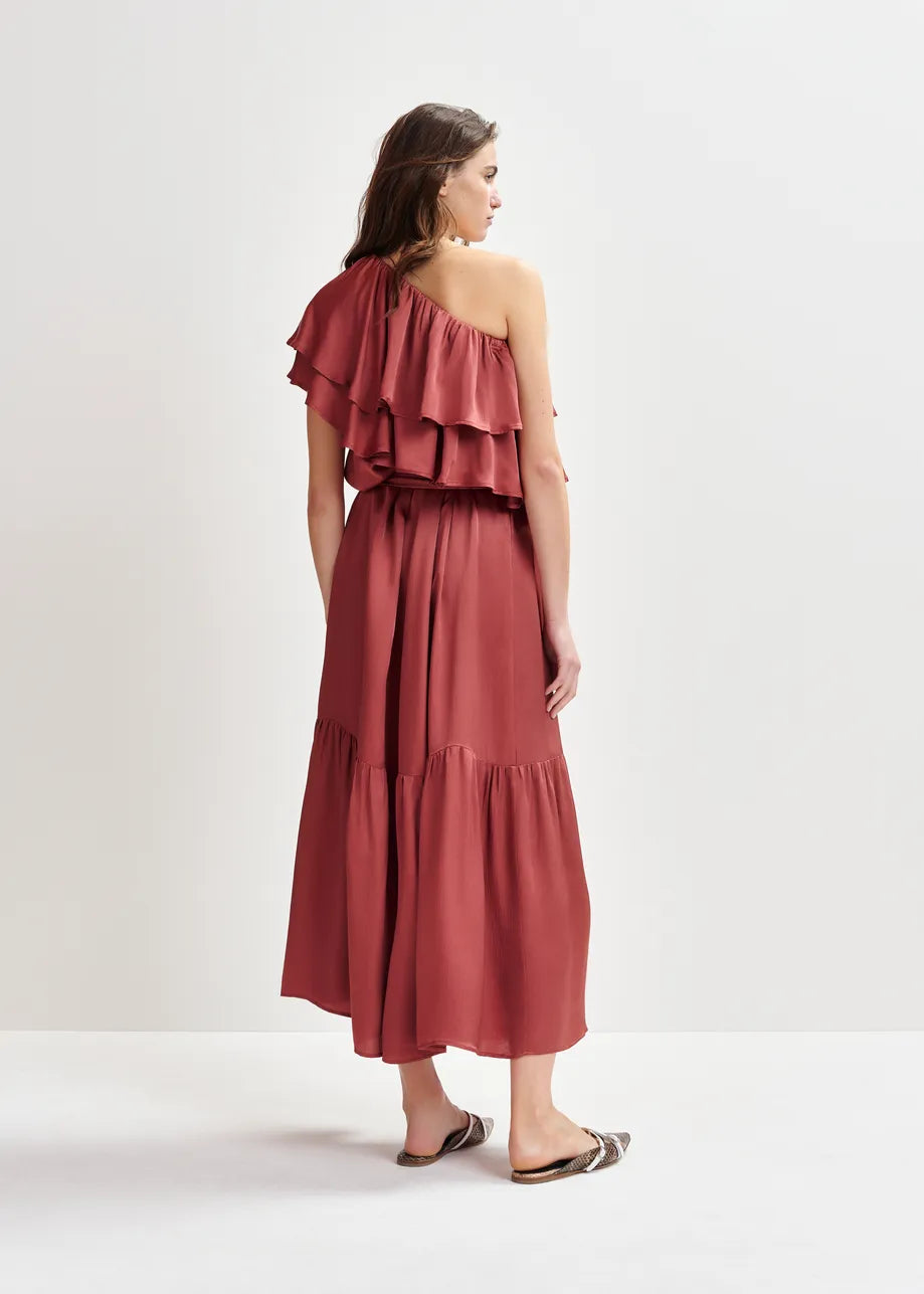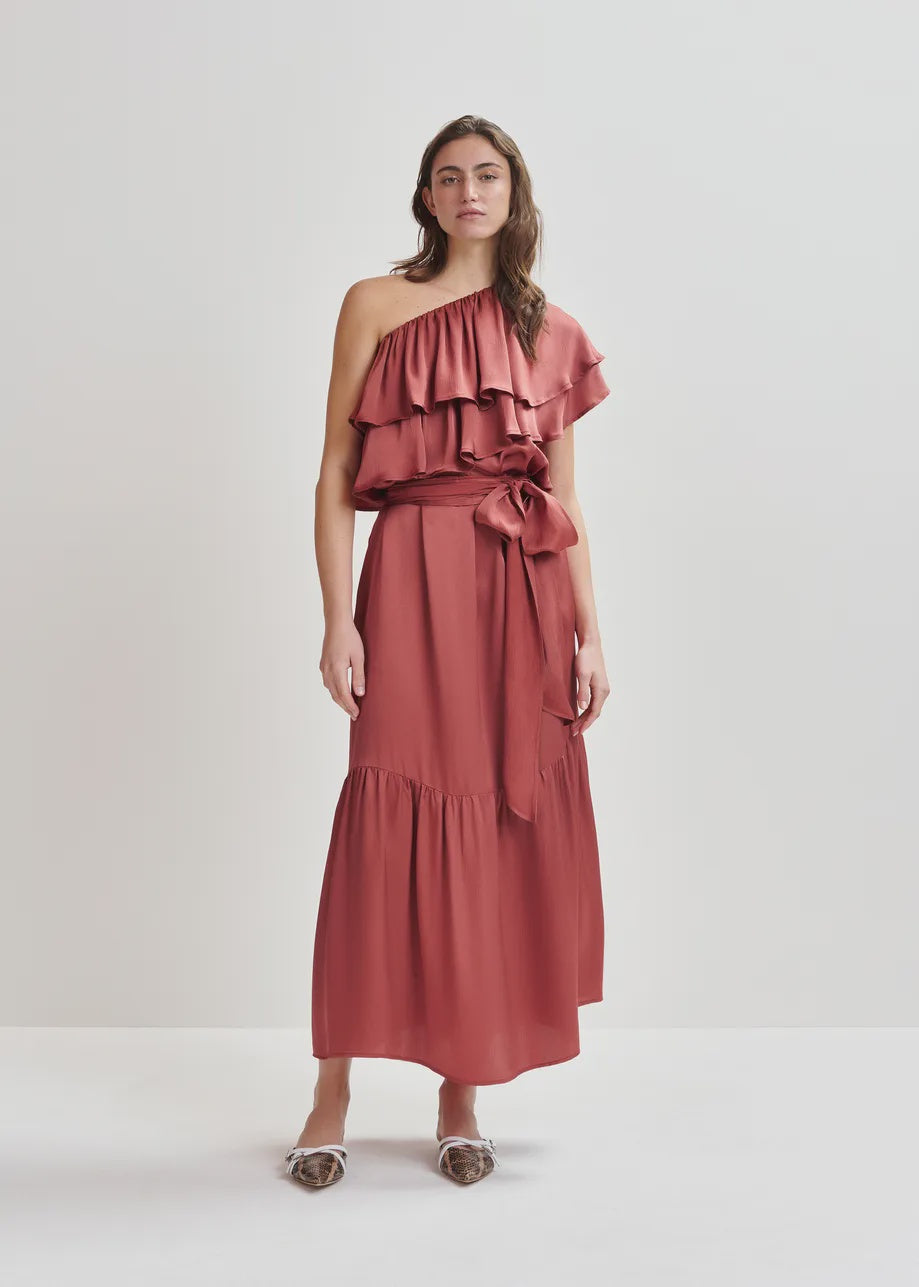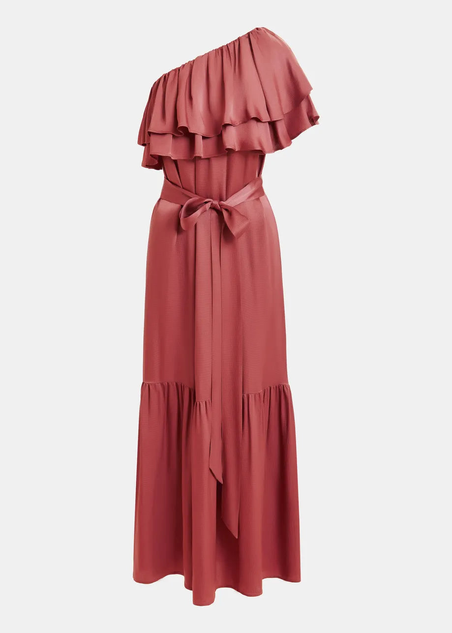 For a romantic touch, this one-shoulder maxi dress is designed to flatter. The cascading ruffles along the neckline add volume and movemen. A cinched waist, accentuated by a self-tie belt, enhances the figure offering an airy fit. The tiered hemline adds subtle texture, making this dress perfect for special occasions, summer soirées, or elegant evening outings.