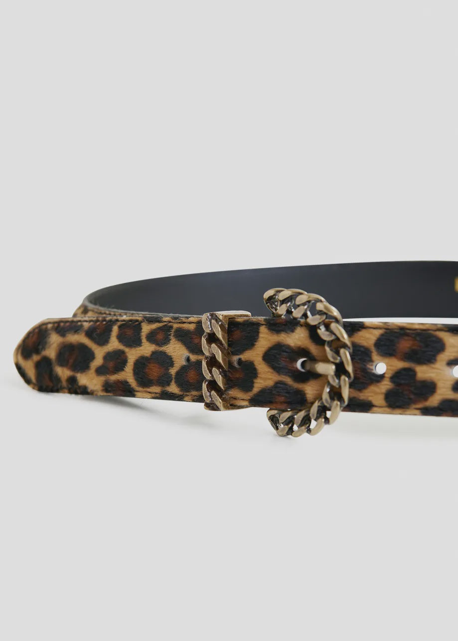 Crafted from leopard-print with a tactile, short-fur finish, it’s designed to sit at the waist or hips depending on your styling. The metal buckle echoes the look of interlinked chains, adding a sculptural, jewelry-like feel. Loop it through tailored trousers or cinch it over a blazer to elevate everyday looks with bold texture and attitude.