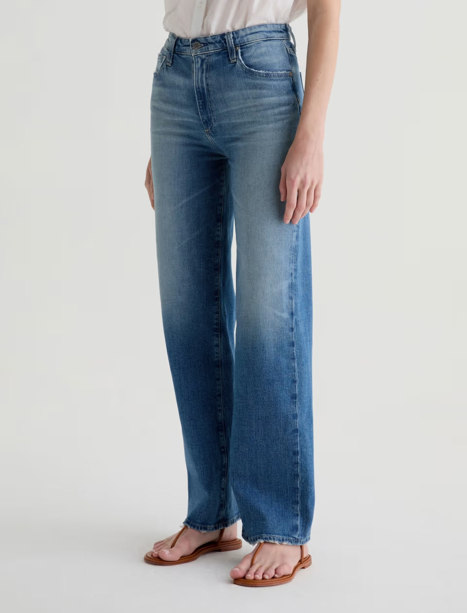 The Kora jean is a high-rise style with a 32” inseam and a subtly wide-leg feel throughout. Made from Italian 11 oz. Journey Denim, its medium wash is AG-ed™ to resemble 13 years of wear.