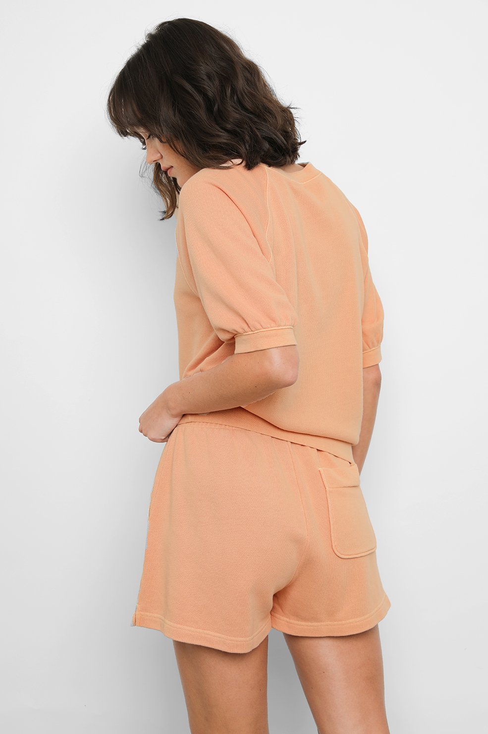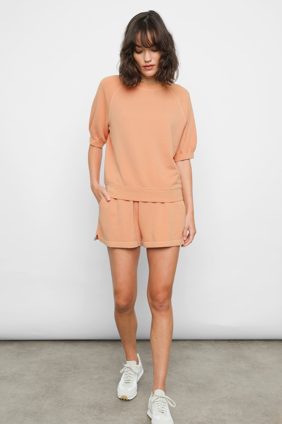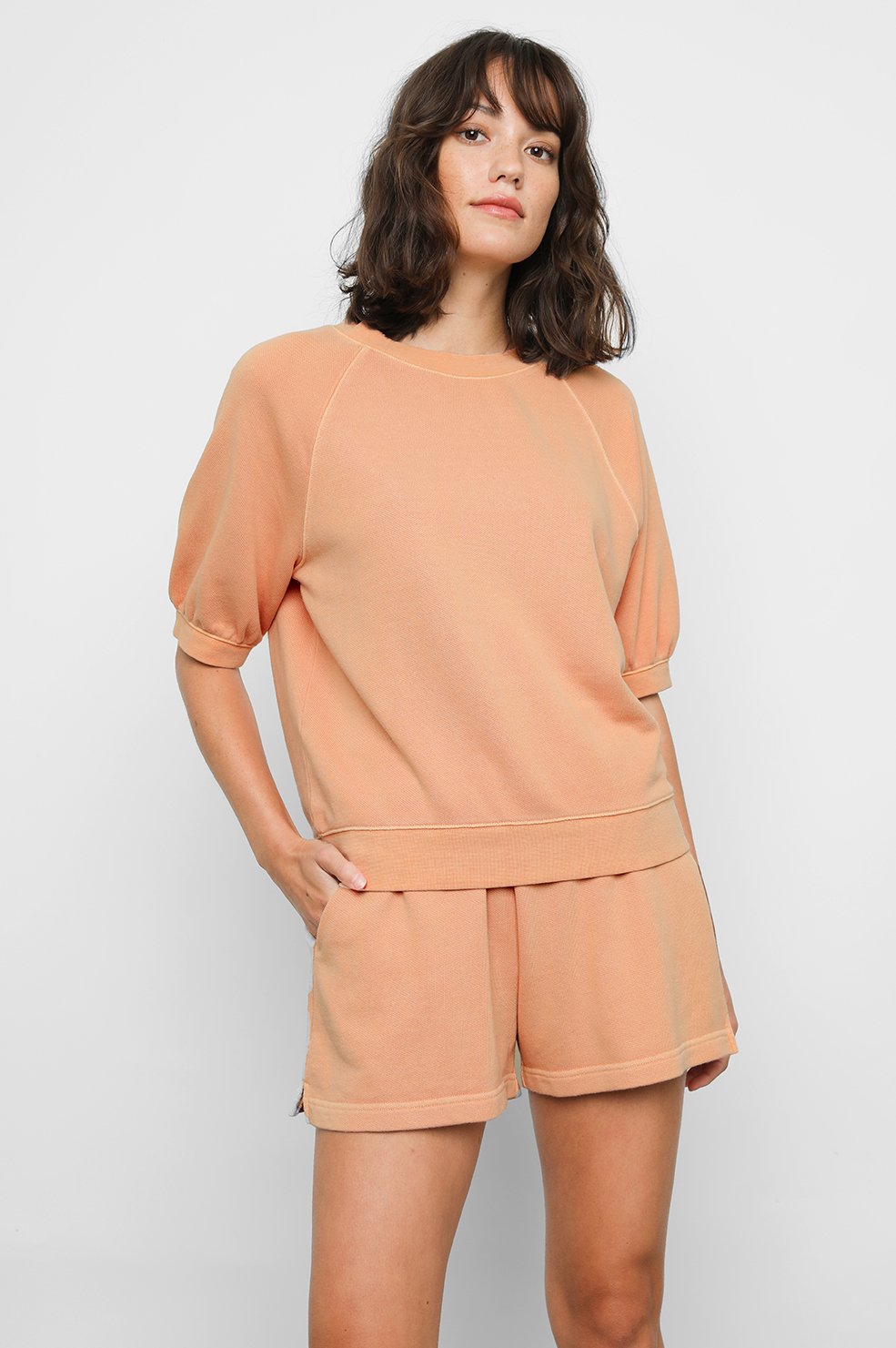 Super relaxed, vintage terry, short sleeve, lemon yellow crew neck puff sleeve sweatshirt featuring vintage wash finish, boxy fit, raglan sleeves, shirring at shoulder, and banded cuff at elbow. This super soft, lounge worthy pullover style is perfect for relaxing at home or going about your day in the most comfortable fashion.