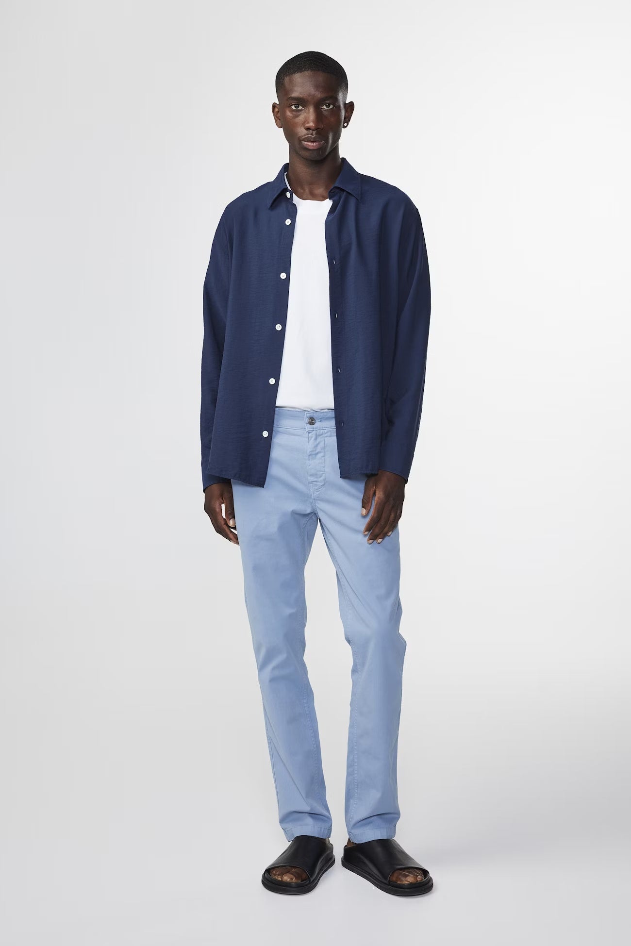 Our original slim fit chino with tapered leg, made in 250 g/m2 Italian cotton with a touch of stretch. Designed with classic welt pockets and finished with zip-fly fastening. An everyday essential.
