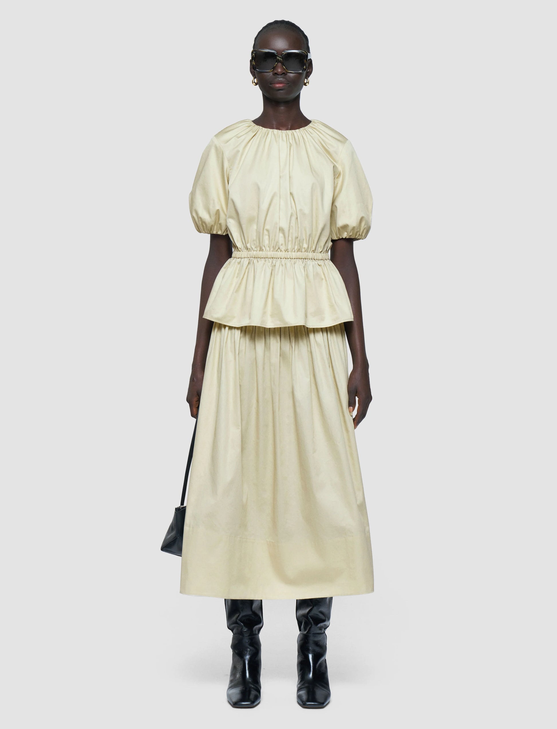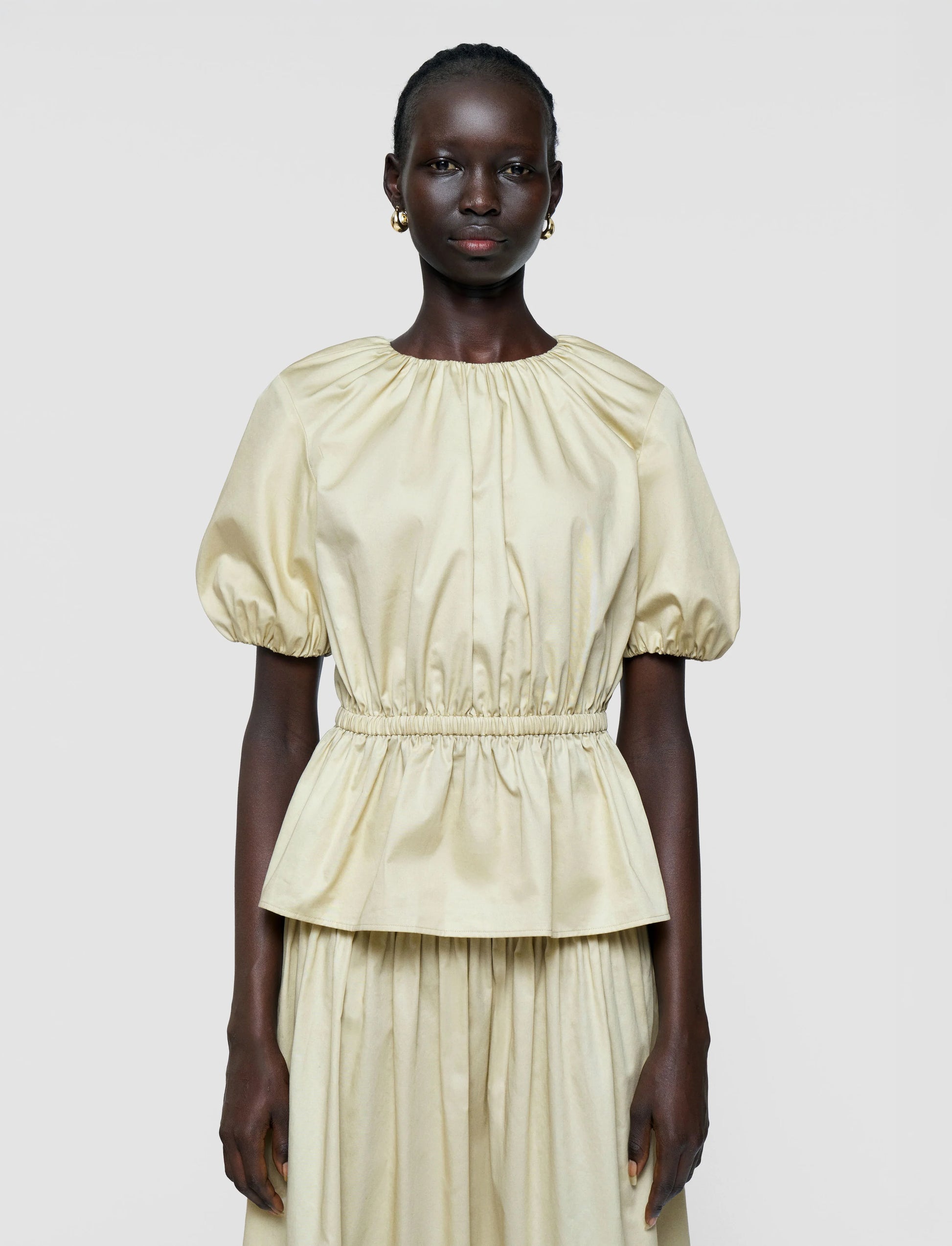 The Merlin Cotton Sateen Blouse is a peplum style top, crafted from a durable cotton which has a smooth hand feel and a sheen finish. It features an elasticated waist and balloon sleeves with elasticated cuffs.