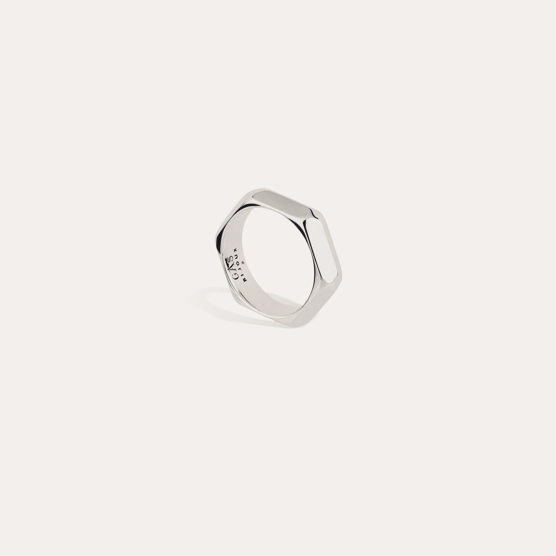 Silver-plated ring, handcrafted in our Marseille workshop. Its geometric design is inspired by gemstone facets, creating a subtle and refined play of light. A sculptural, pure, and timeless piece to wear solo or stacked.