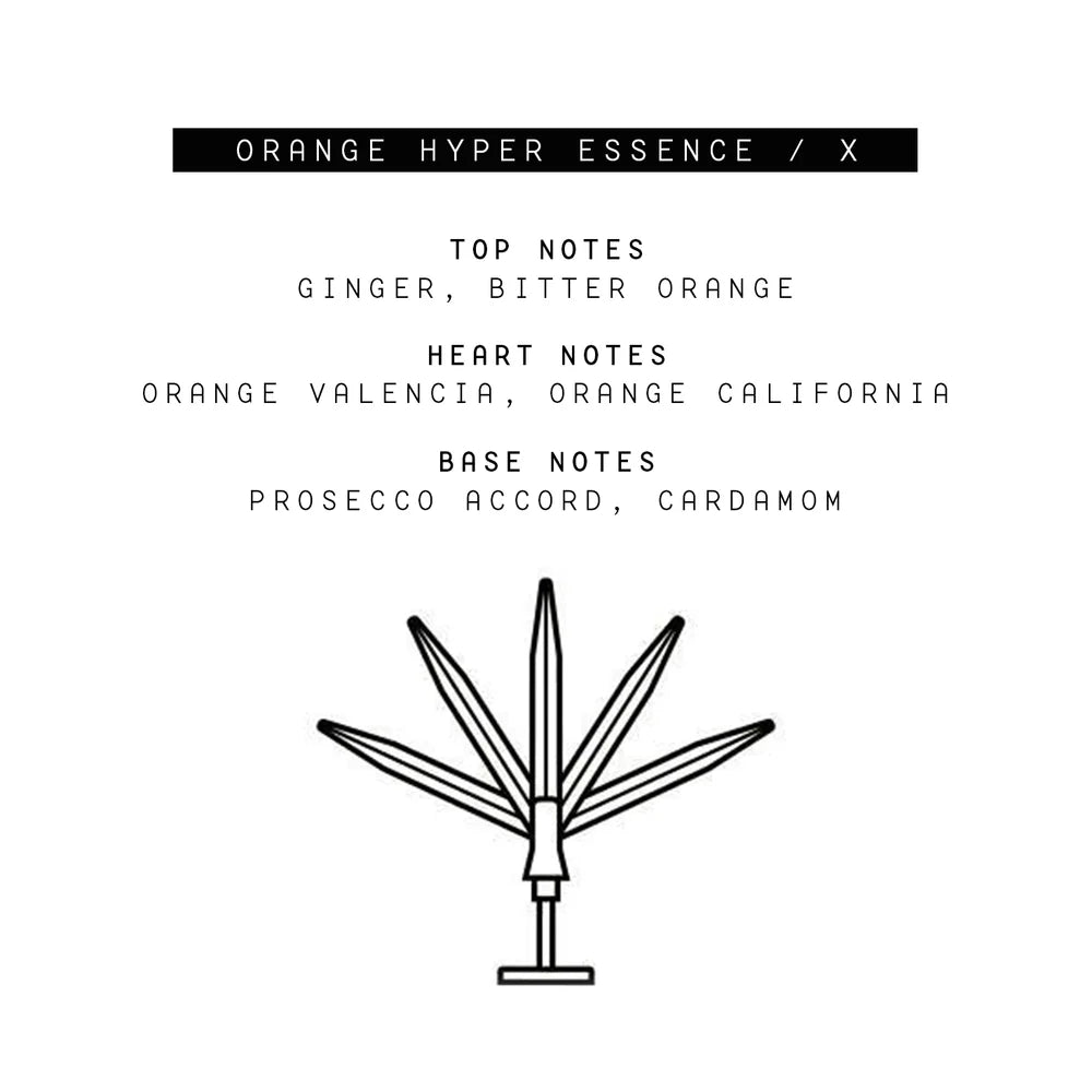 Orange Hyper Essence / X reveals a tonic brightness where the core essence of orange blends with fine bubbles and a hint of spices. The heart of two exceptional varieties: oranges from Valencia under the Spanish sun and oranges from the Californian valleys come together, blending with a slightly spicy note of ginger. A luminous intensity, perfectly balanced between zestful glow and the juicy sweetness of the fruit, capturing the purest essences of orange. An orange like you have never experienced before. Cardamom, a solar and woody spice, adds a soft and warm richness, while fine bubbles inspired by a Prosecco accord mix the composition with a light and refreshing sparkle. Orange Hyper Essence / X appeals to those who enjoy bold, fresh and balanced fragrances. This scent will captivate admirers of Tomboy Neroli, Wake Up World or Haute Provence who appreciate sophisticated fragrances. Made in France.