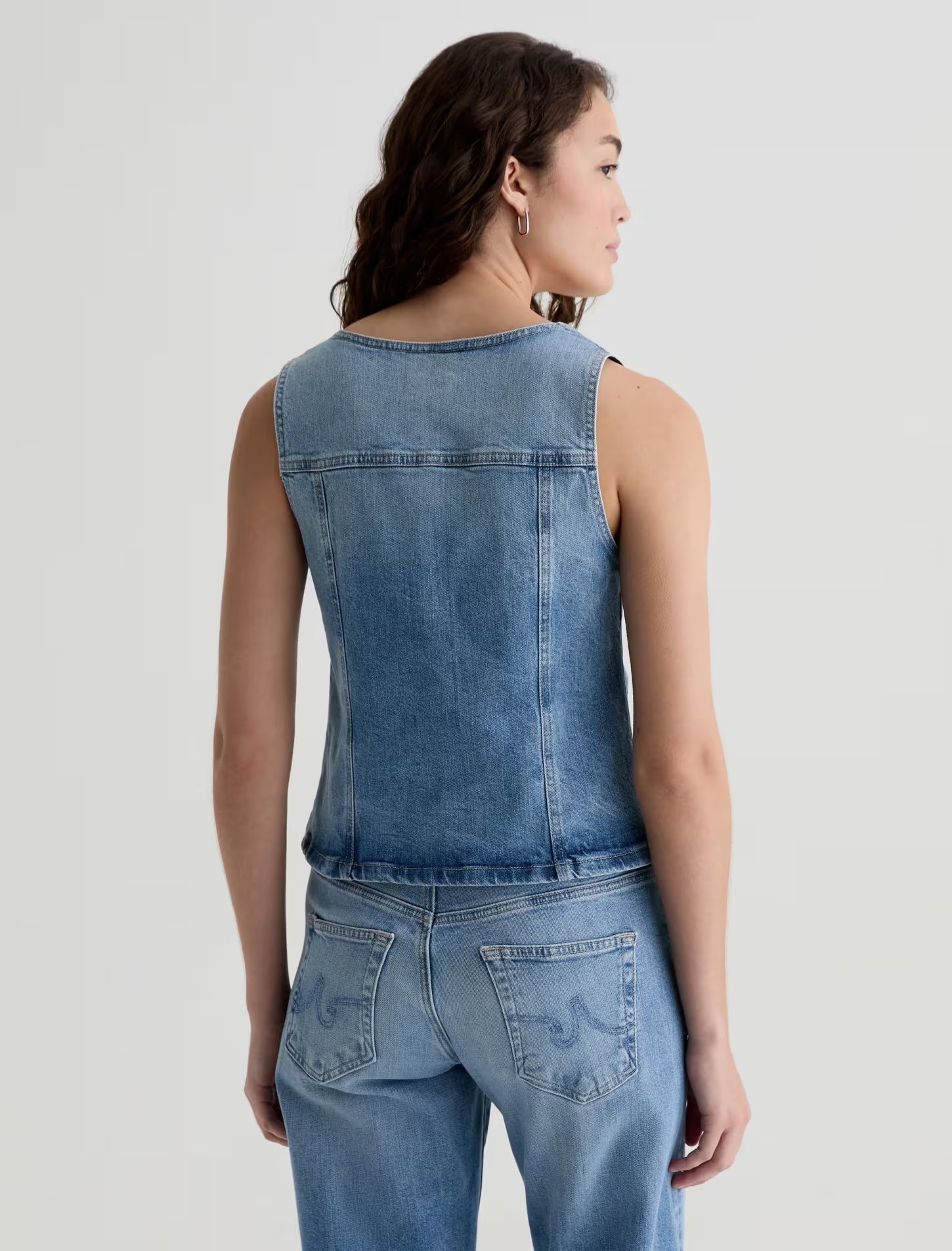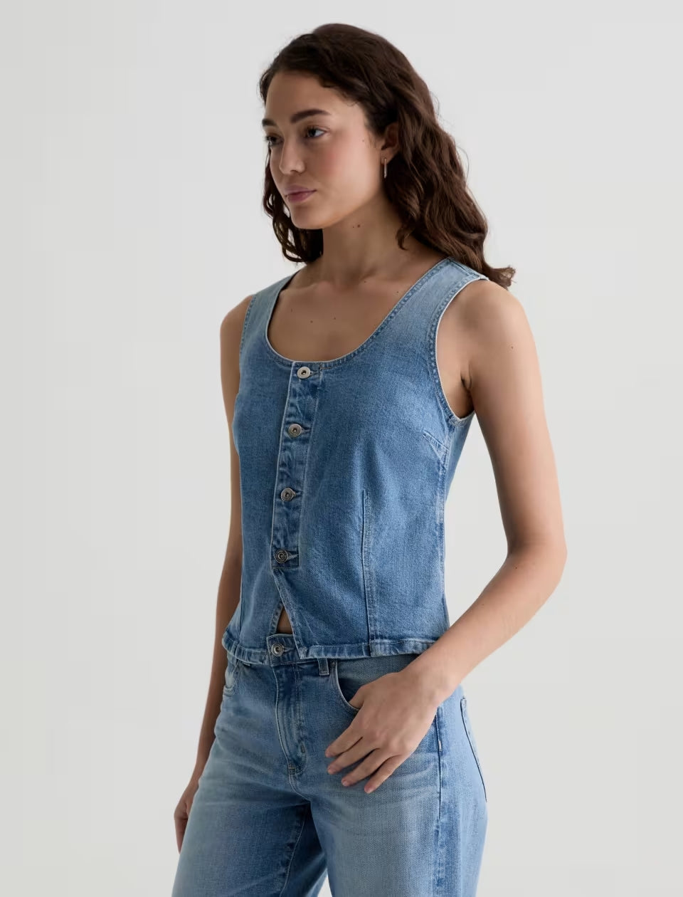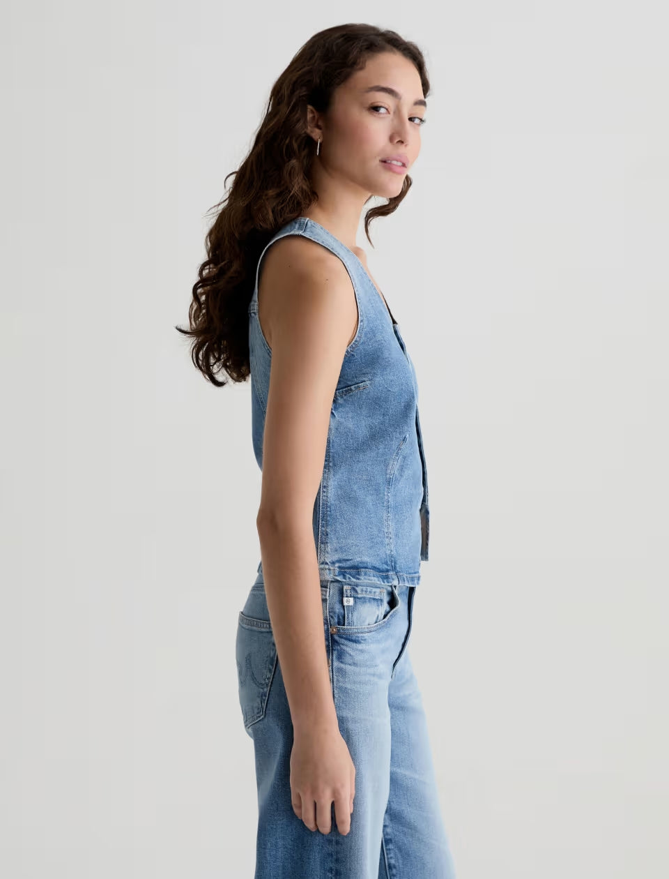 The Teagan Tank is a slim-fitting denim top with a sleeveless design and a center front closure. Made from 11.75 oz. Vintage Comfort Stretch Denim, it comes in a light indigo wash with subtle fading for a sun-worn look.