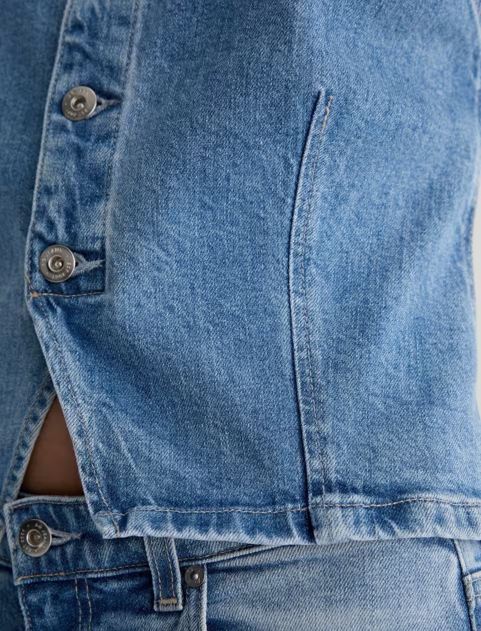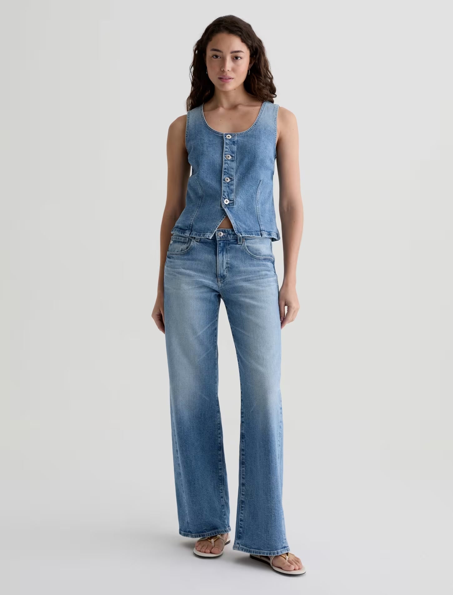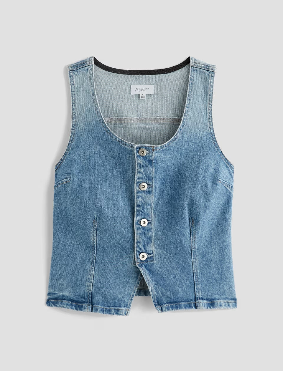 The Teagan Tank is a slim-fitting denim top with a sleeveless design and a center front closure. Made from 11.75 oz. Vintage Comfort Stretch Denim, it comes in a light indigo wash with subtle fading for a sun-worn look.