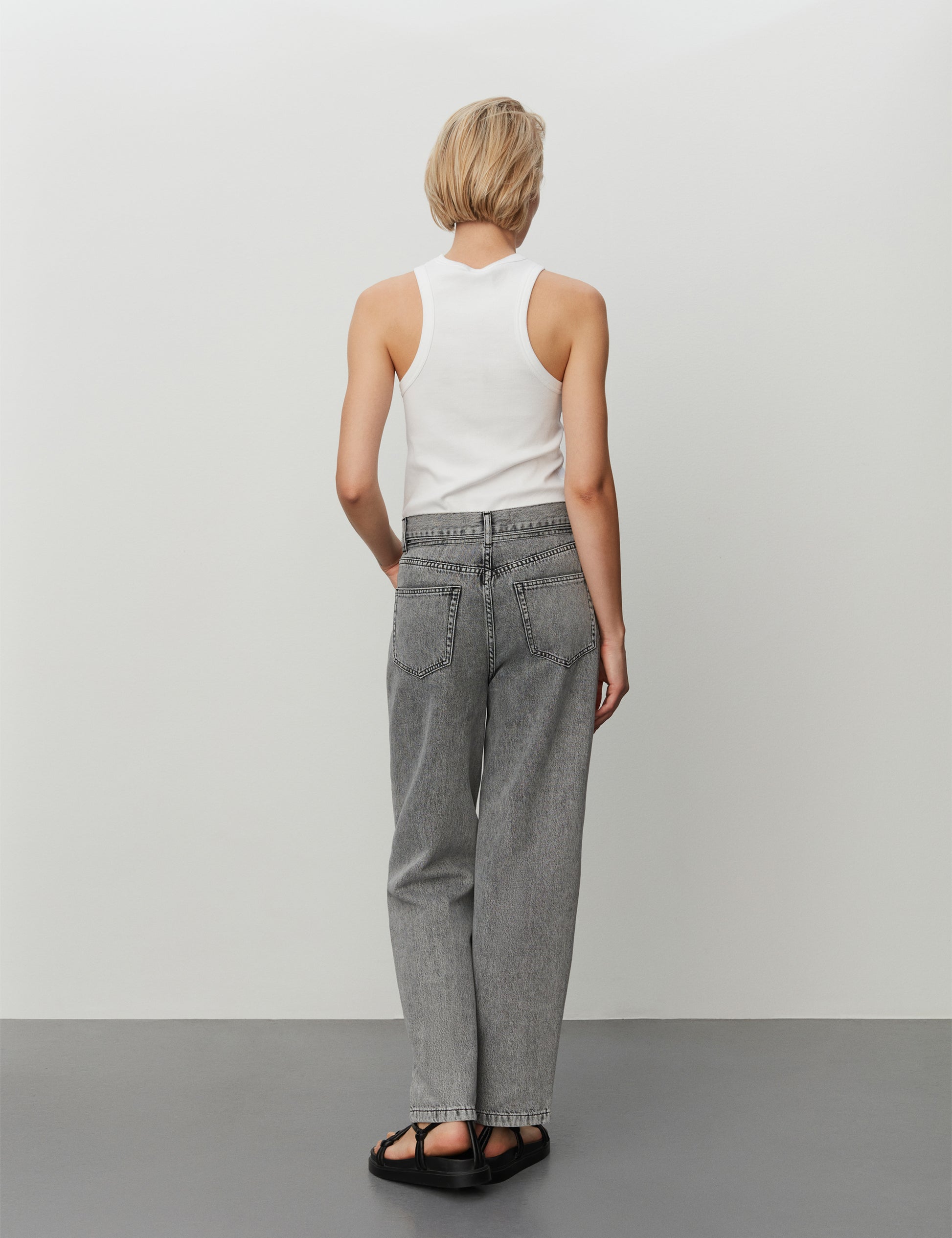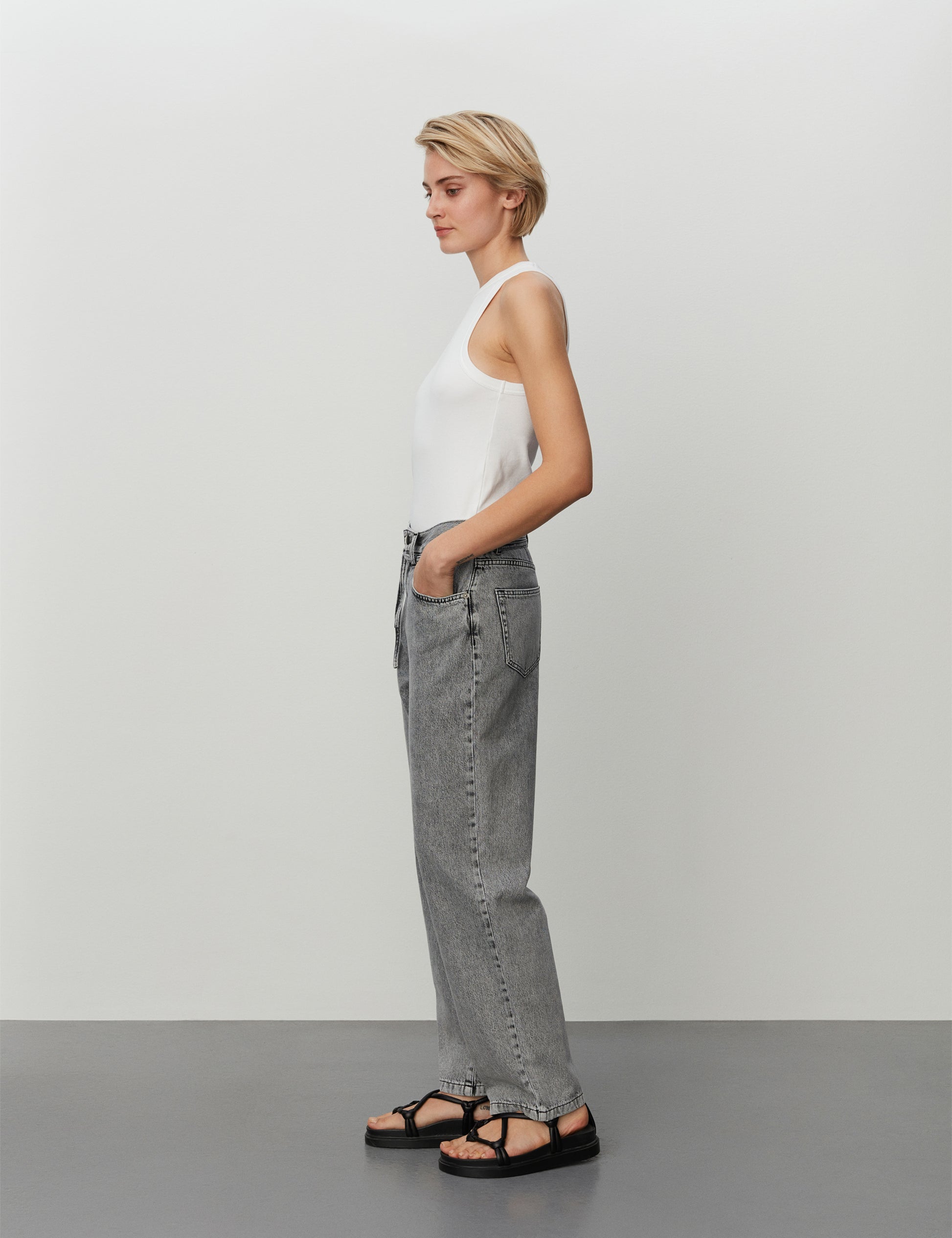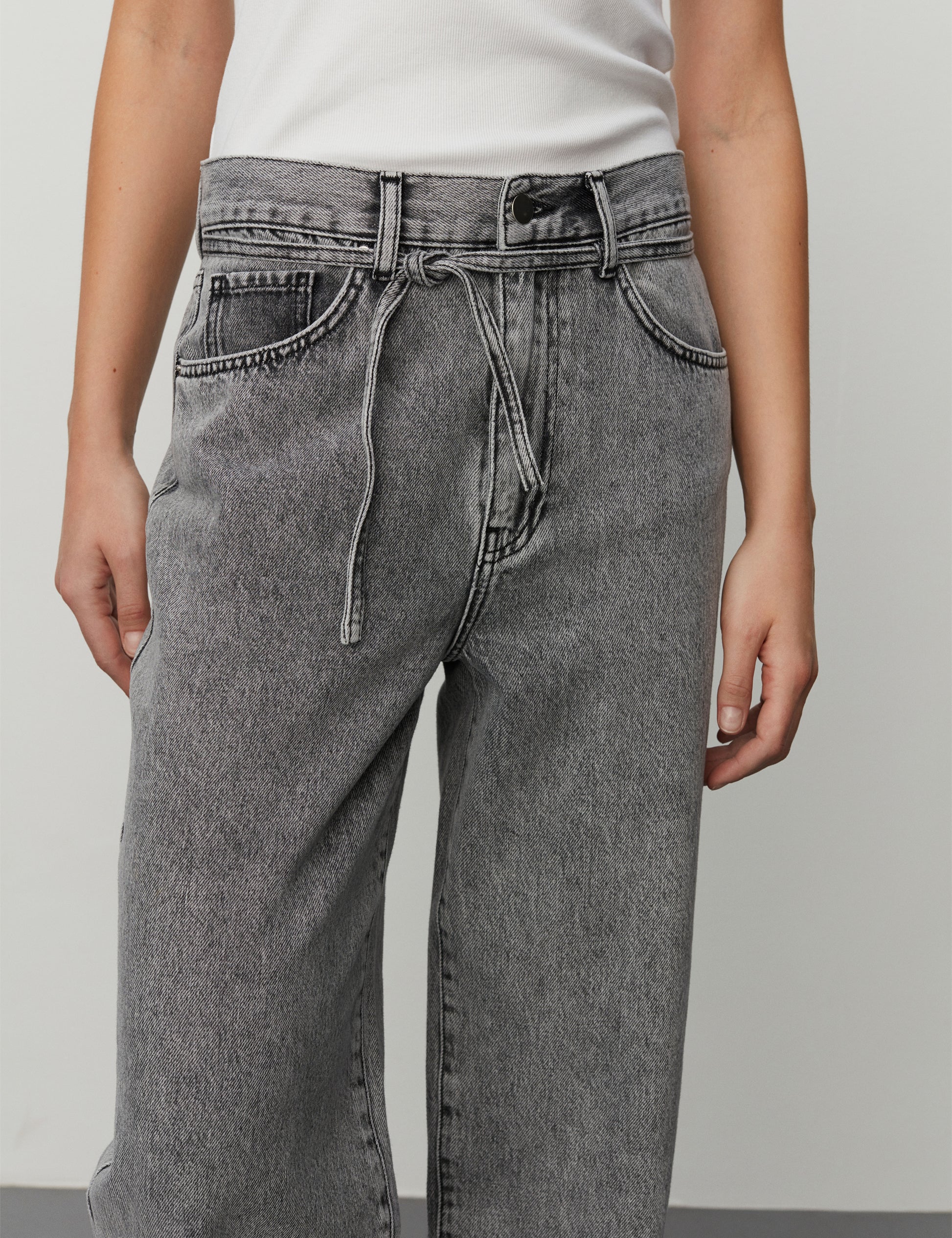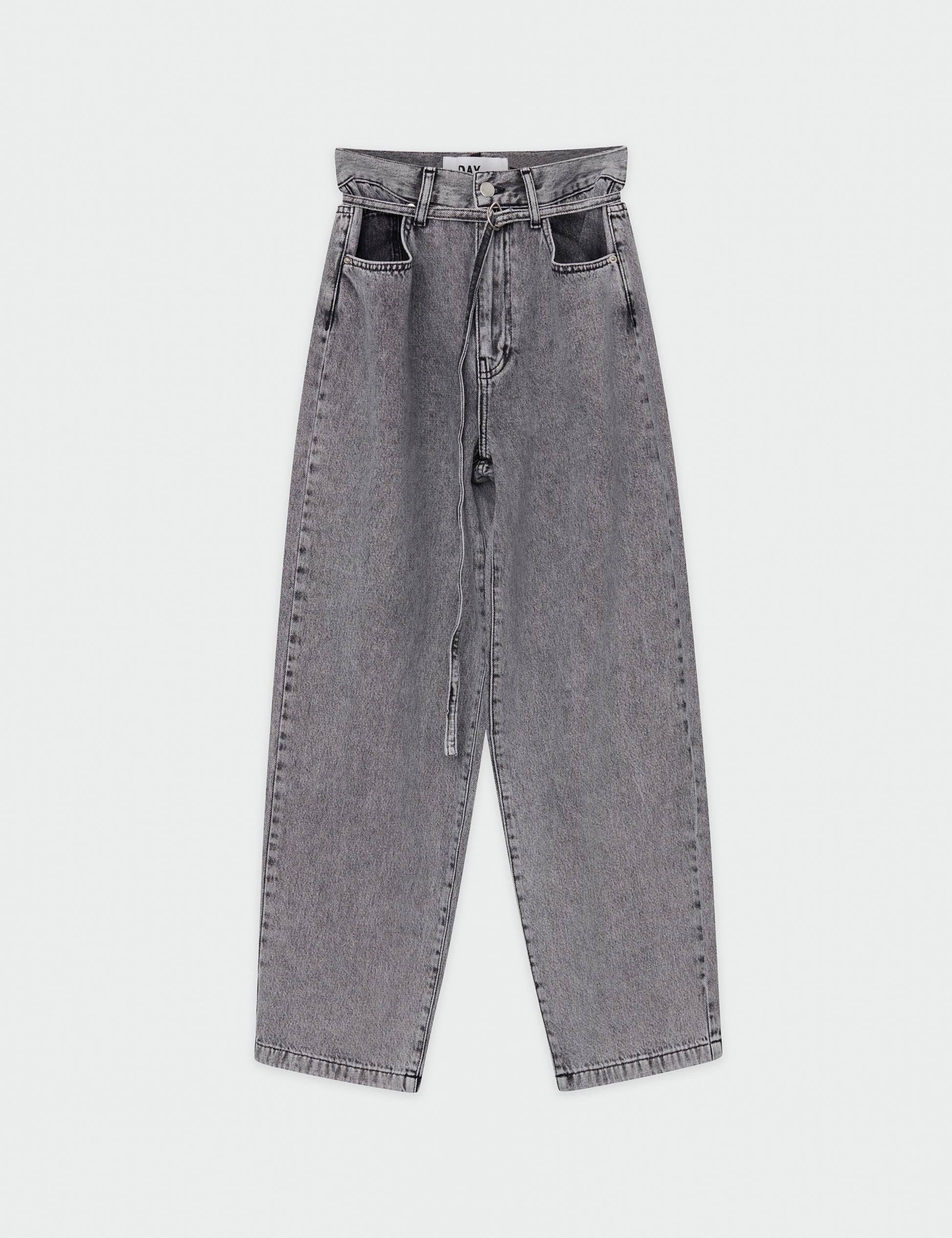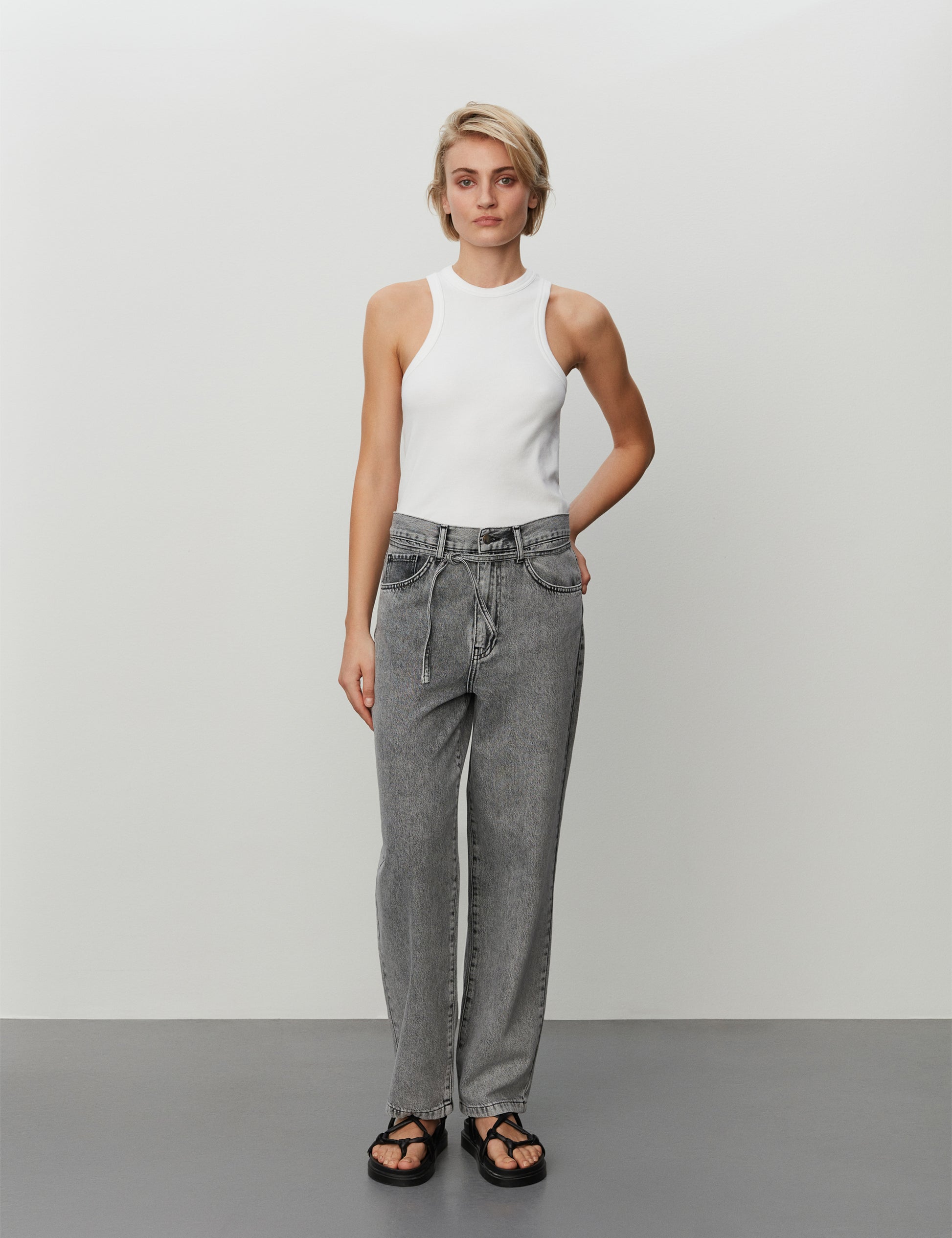 These high-rise, five pocket jeans have a slightly tapered leg, zip fly with button closure, and a removable tie belt at the waist. These jeans have a regular fit.