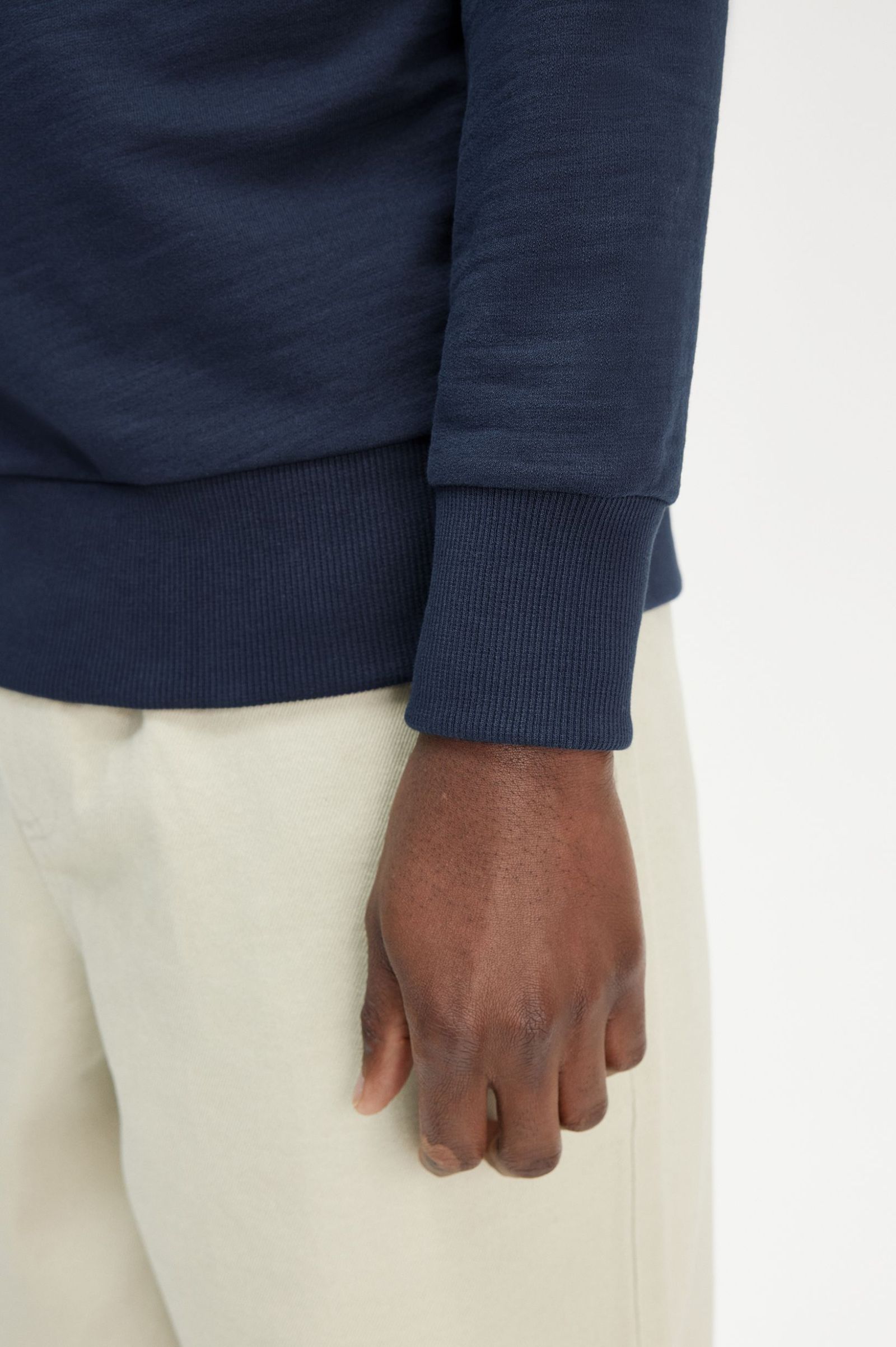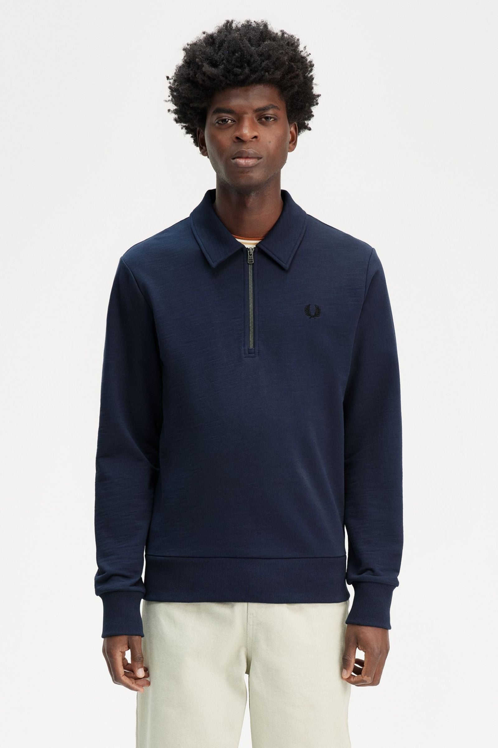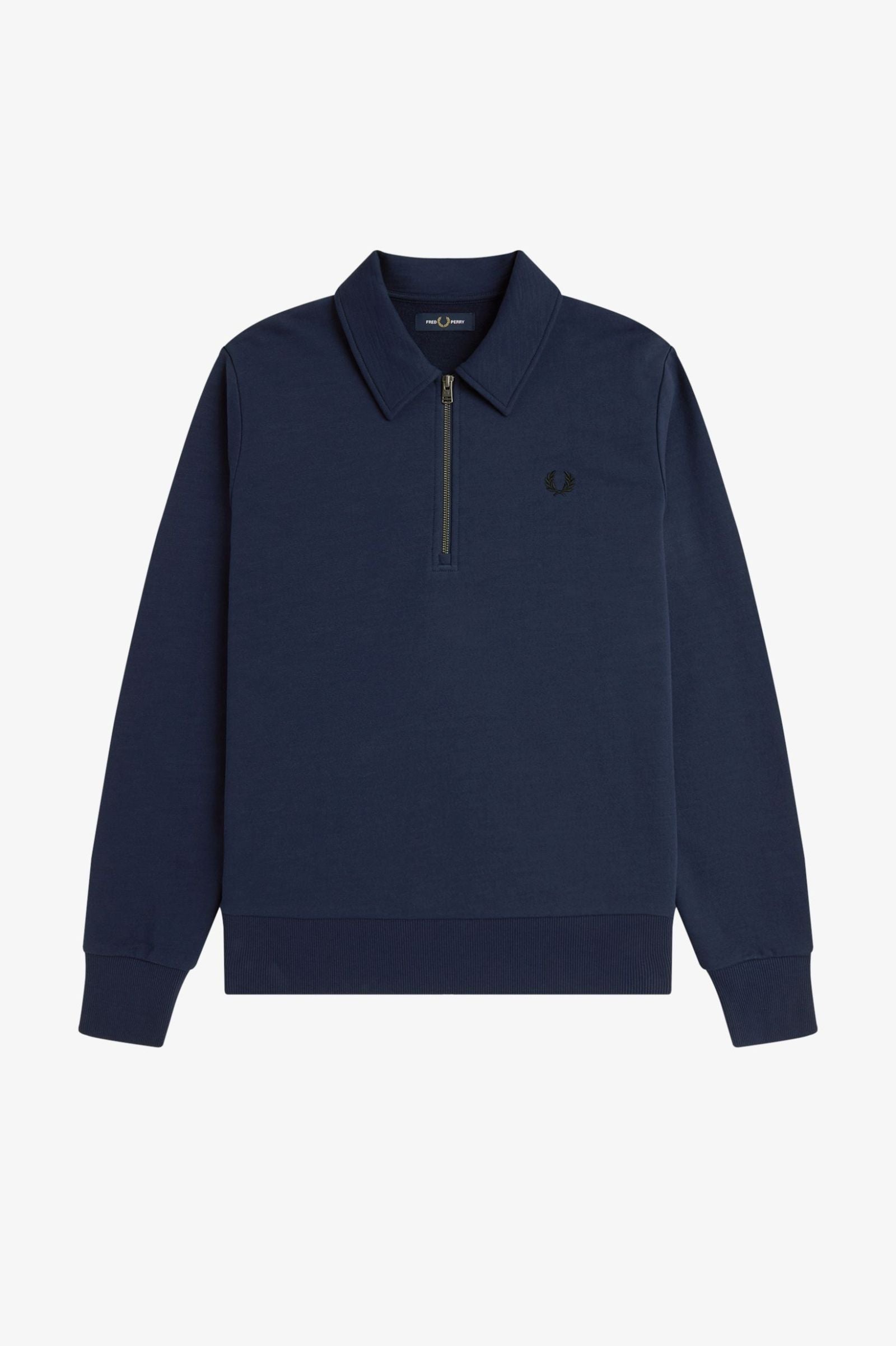 French terry sweatshirt with a sharp collar, half zip, and branded puller.
